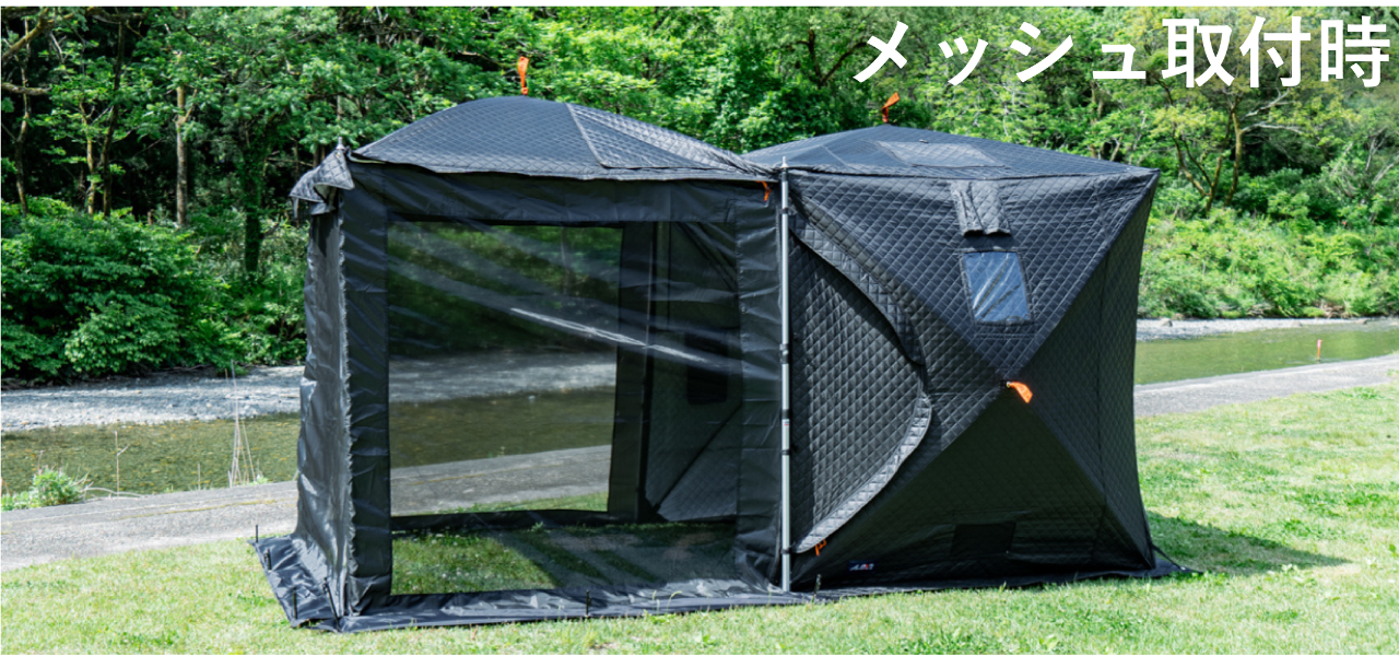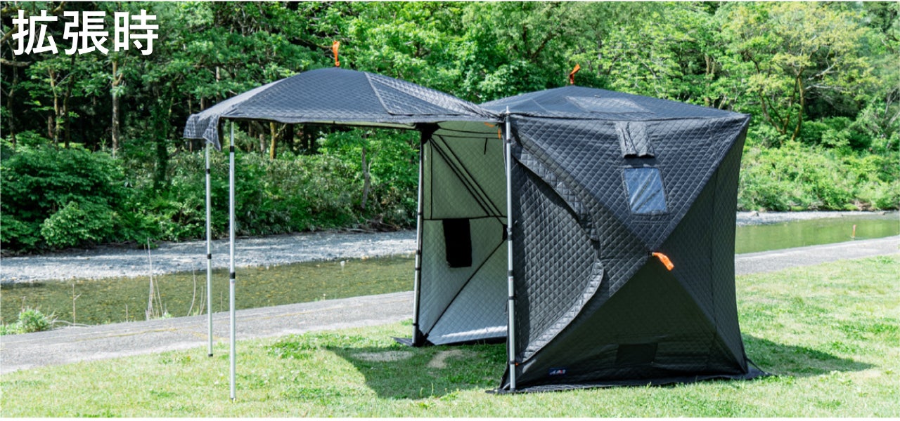 テントサウナをしたあと、そのままキャンプができます。サウナが終わったあとにテントの一面を跳ね上げ、ポールで固定することにより、そこが屋根となってキャンプのベース基地になります。つまり、タープ代わりになります。さらに付属の蚊帳を取り付ければ、広々とした奥行きのあるテントに。グランドシートを敷いたり、コット(アウトドアベッド)を置くことで、そのまま宿泊も可能です。テントサウナをするとき、自然のなかの気持ちいい場所を探しますよね。せっかく見つけた場所なのだから、サウナ後そのまま余韻に浸ってほしくて、この機能を備えました。