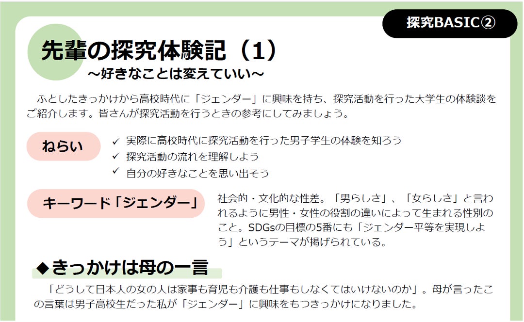 実際の探究事例をもとにしたケーススタディ。探究の実例をテキストで学びながら、探究イメージをつかみ、手 法を学べる設計としている。探究学習で用いられる「SDGs」に関しても、SDGsへの理解を深め、実際の企業の 事例を交えながら学ぶコンテンツを開発した。生徒はワークシートに自分の考えを書き込みながら、個人ワーク やグループワークによって学びを深める。教員が使いやすいよう、導入動画や指導案なども用意している。