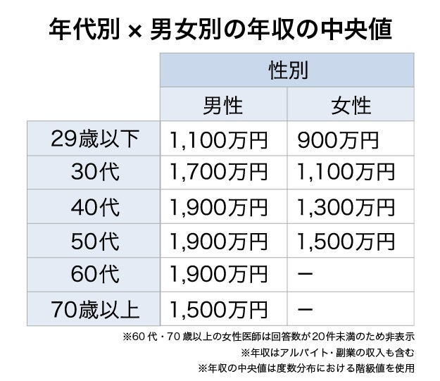医師は高年収の印象を持たれやすい職業で、実際に全体の年収(アルバイト・副業込み)の中央値は1,700万円となっています。
