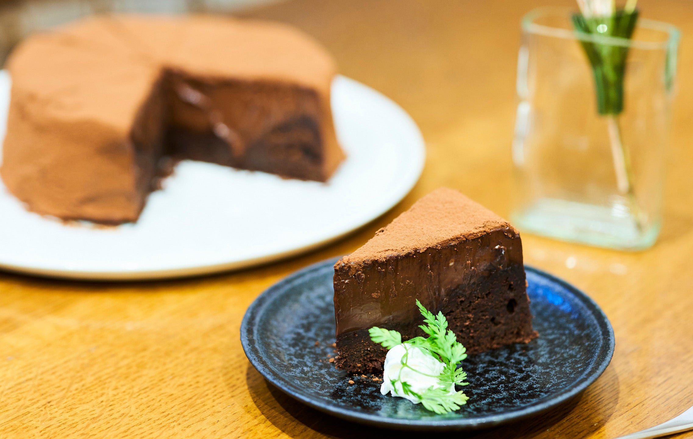 <特徴>グルテンフリーで仕上げた濃厚なチョコレートケーキとガナッシュの2重奏