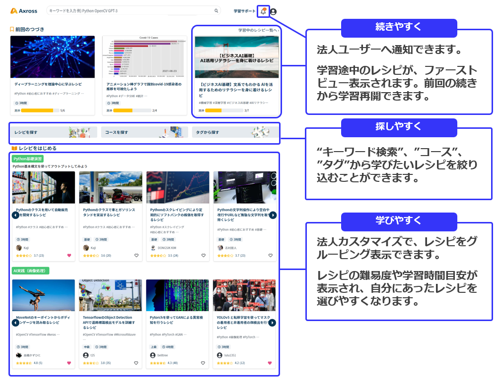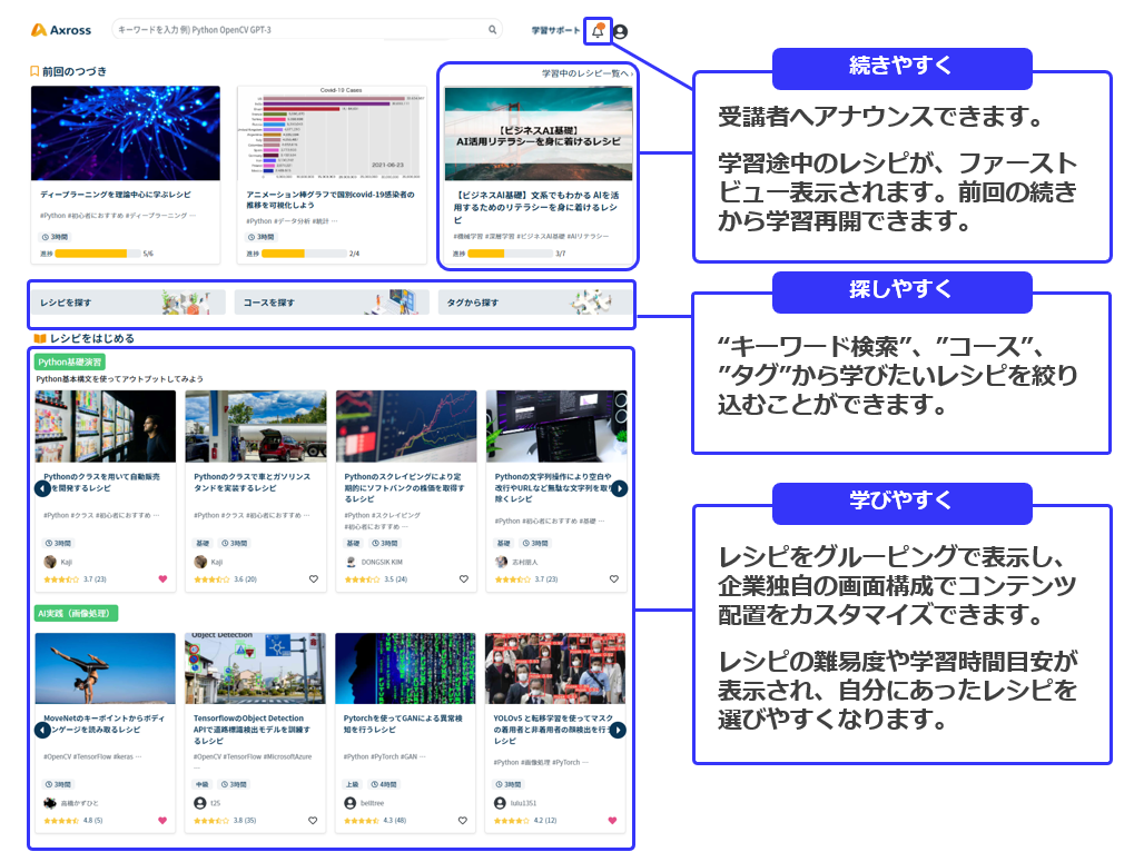 「Axross」(https://axross-recipe.com/recipes)は、現場のAIを中心としたDX活用事例や実践ノウハウを独自の"レシピ"フレームワークを用いて教材化し、『AIを業務に活用するための教科書』としてE-Learning形式で学べるオンライン教育サービスです。