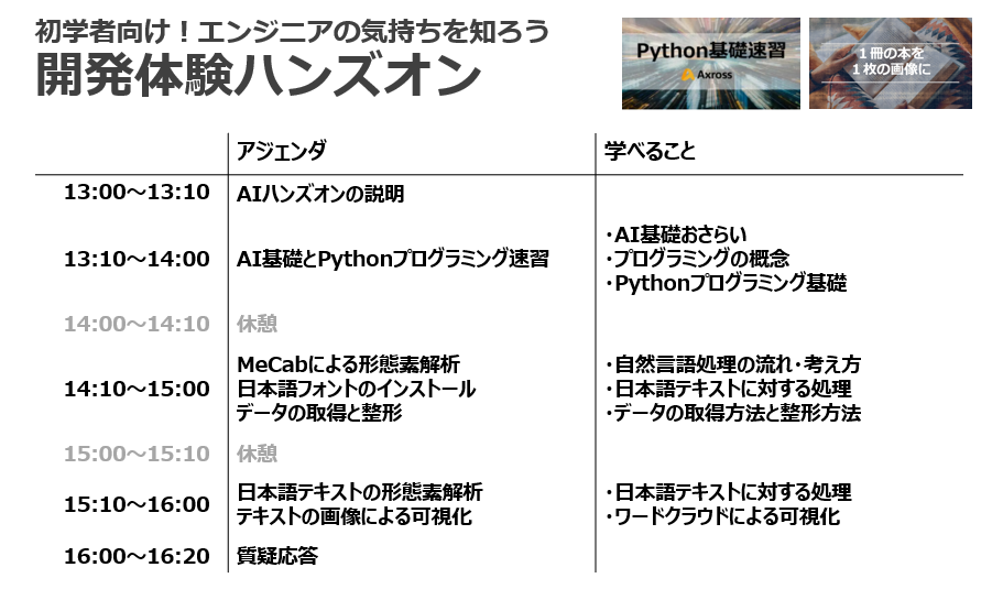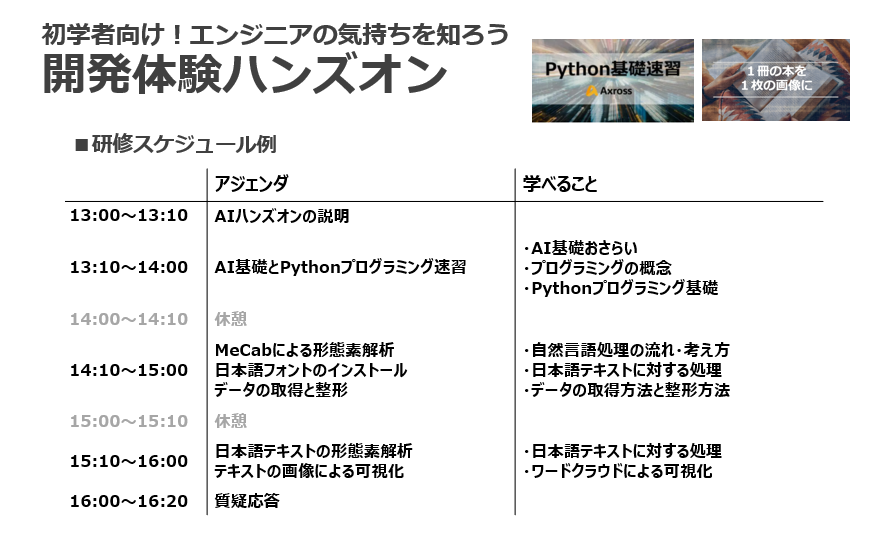 また、AI/DX基礎リテラシーから、Python初学者向け、AI実践・応用まで、実務に活かすための体験型AI開発ハンズオン研修もご提供いたします。