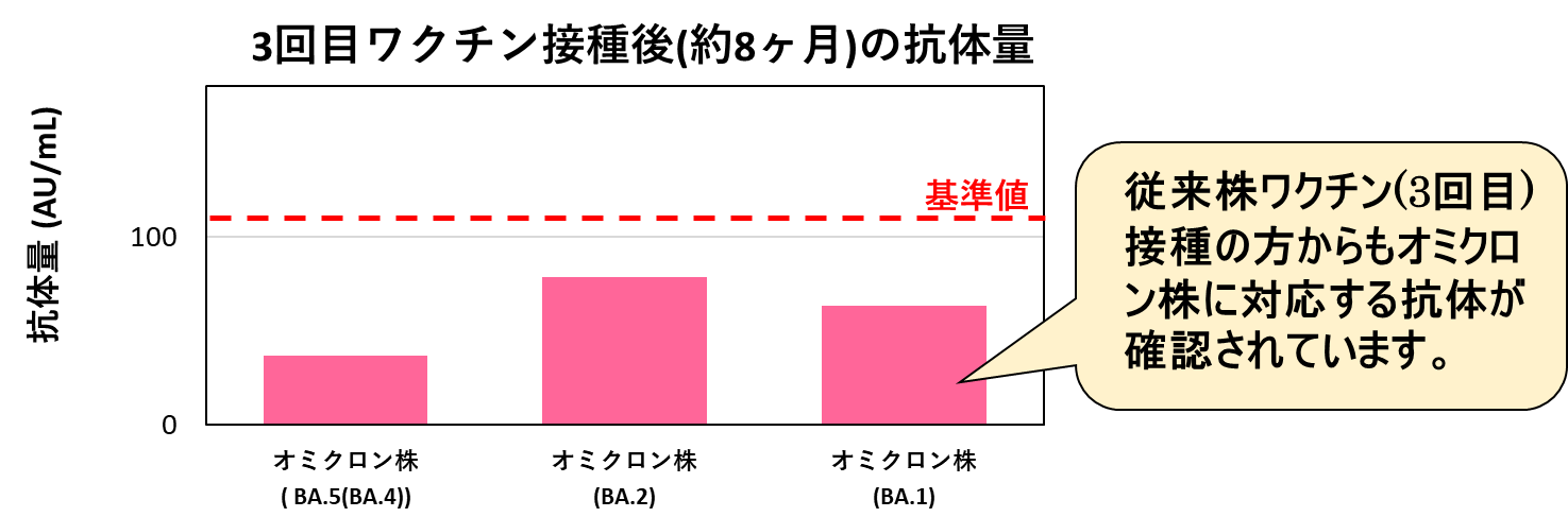 オミクロン株対応の2価ワクチン接種により、変異株( BA5、BA2、 BA1 )に対応する抗体がつくられていることを確認しました。