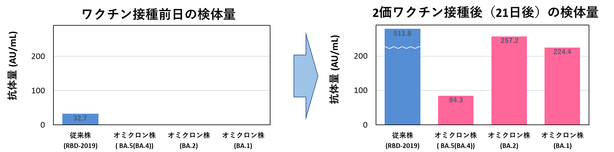 当社の研究所にて、イージードクⓇ『 変異株 抗体検査 』で検査を行い、2価ワクチンを接種された方の血液を使用して抗体量(抗体価)を定量検査したところ、ワクチン接種のビフォー・アフターで、抗体量(抗体価)が増加したことを確認いたしました。