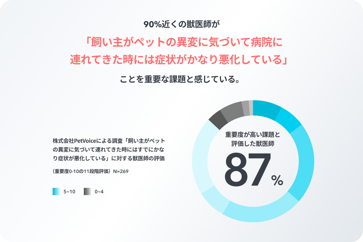PetVoiceでは獣医師約300名に独自にヒアリングし、その理由を調査したところ、「飼い主が病気に気付いて動物病院に連れてきた時には既に手遅れになっている」ことが分かりました。