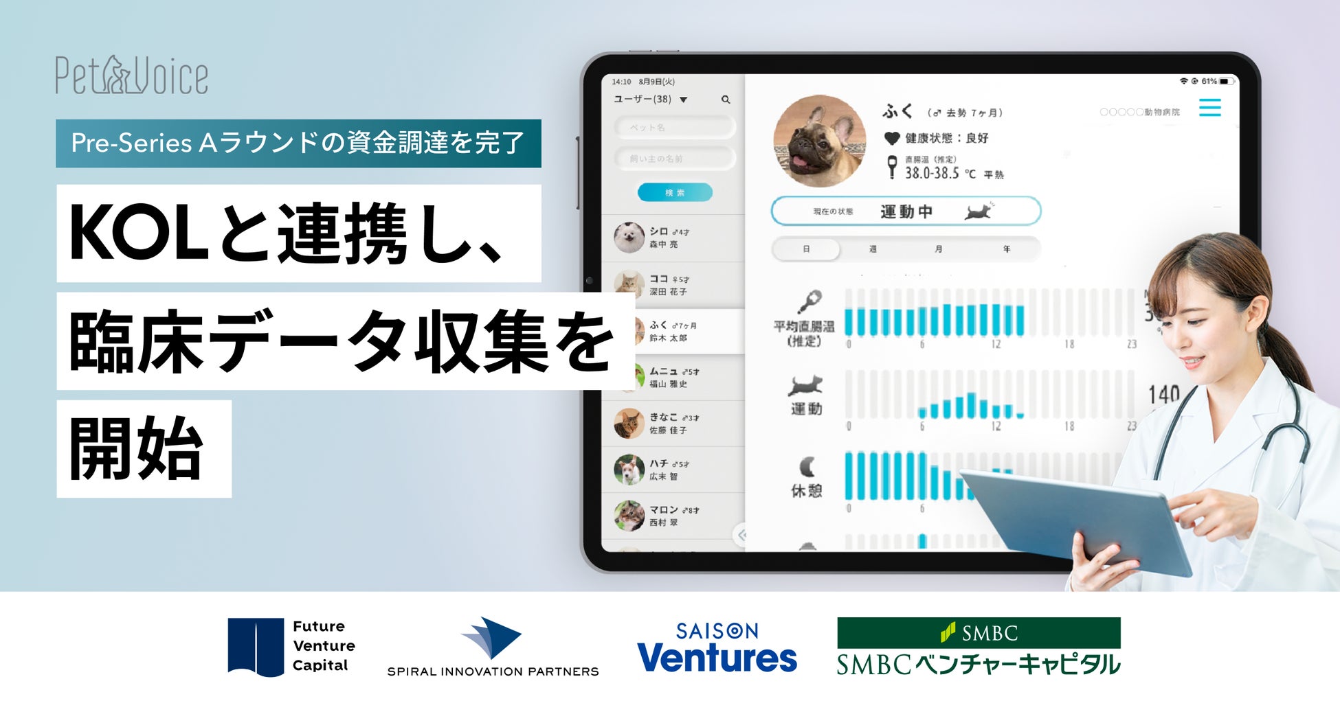 「ペットに健康な毎日を」を掲げ、イヌネコ専用活動量計『PetVoice』を提供する株式会社PetVoice(代表取締役CEO 深田 篤)は、フューチャーベンチャーキャピタル株式会社(東証スタンダード市場上場 コード8462)とSpiral Innovation Partners LLP(T&Dイノベーション投資事業有限責任組合)を共同リードとし、株式会社セゾン・ベンチャーズ、SMBCベンチャーキャピタルを引受先とする第三者割当増資により、総額1.5億円の資金調達(以下、本調達という)を完了したことをご報告いたします。