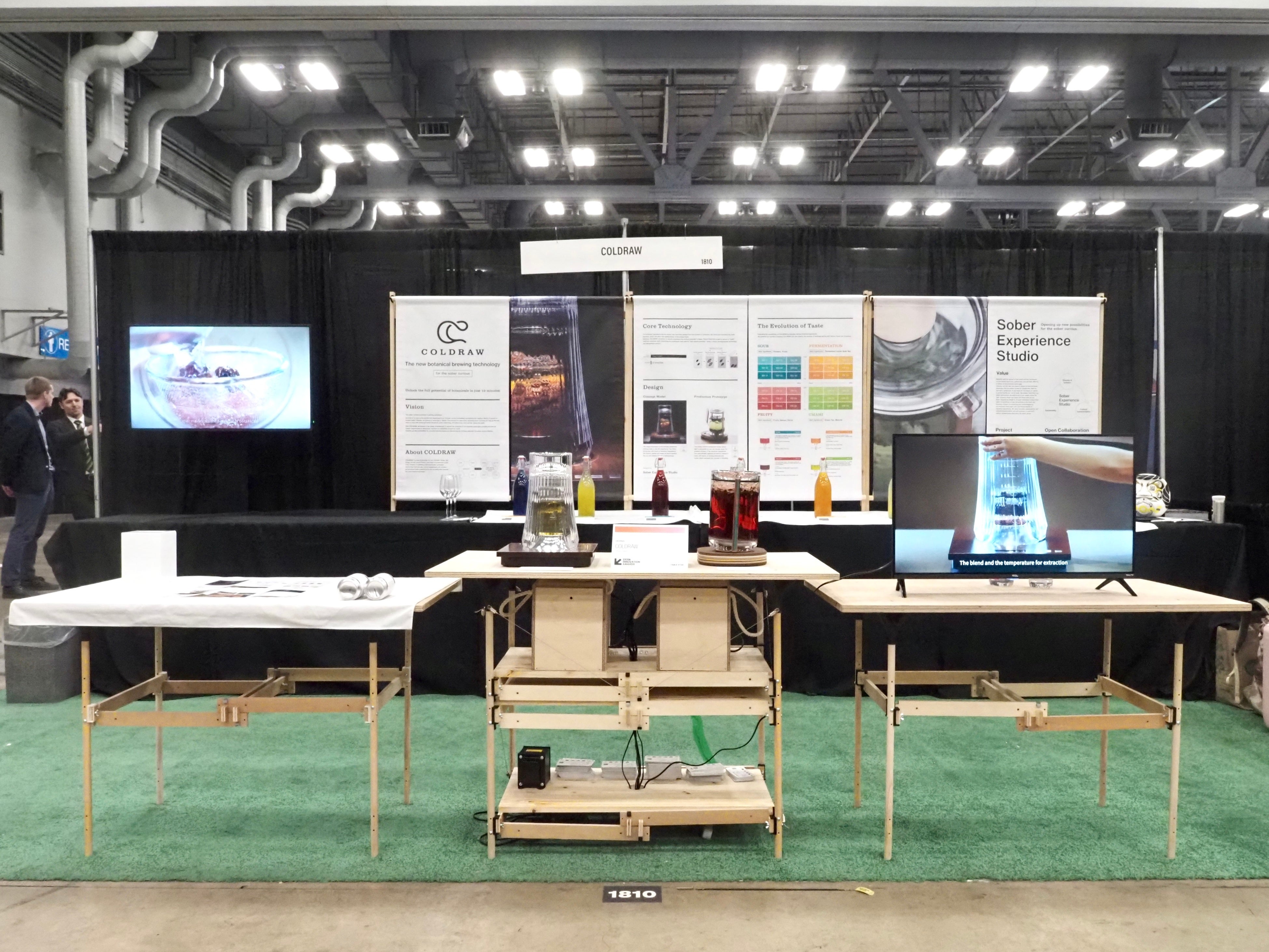 出展ブースはCOLDRAWのコンセプトモデル、プロダクションプロトタイプの実機を中心に置き、COLDRAWのビジョンやテクノロジー、Sober Experience Studioのバリューなどを背面に設置。什器は3Dプリンターを活用し、軽量・省資源で展示後も繰り返し使えるよう独自で作成・設置し、サステナブルを重視するプロジェクトの姿勢を表現しました。