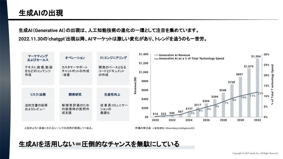 今後AIの重要性はますます高まり、AI技術の導入は貴社の成果を最大化するための強力なパートナーとなることでしょう。