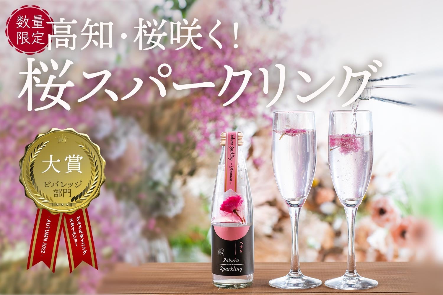 花びらをグラスに入れスパークリングを注ぐと、グラスの中に桜の花がぱ~っと咲き、お祝いやギフトにもぴったりの華やかさ。また高知県産手絞りレモンを加え、甘さと酸味のバランスが良くスッキリとしたのどごしも魅力です。オリジナル”桜のエコバック”入りでお届けします。グルメ&ダイニングスタイルショー2022秋ビバレッジ部門大賞を受賞し、オンラインショップでも数量限定で販売中。
