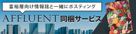 月刊誌「AFFLUENT」は、都内高級タワーマンションを中心に高級住宅街にお住まいの方や開業医・士業など、経済的にゆとりのあるターゲット層へ直接DM発送でお届けしています。東京版約10万部、名古屋版・大阪版・福岡版・横浜湘南版・千葉版約8万9千部。