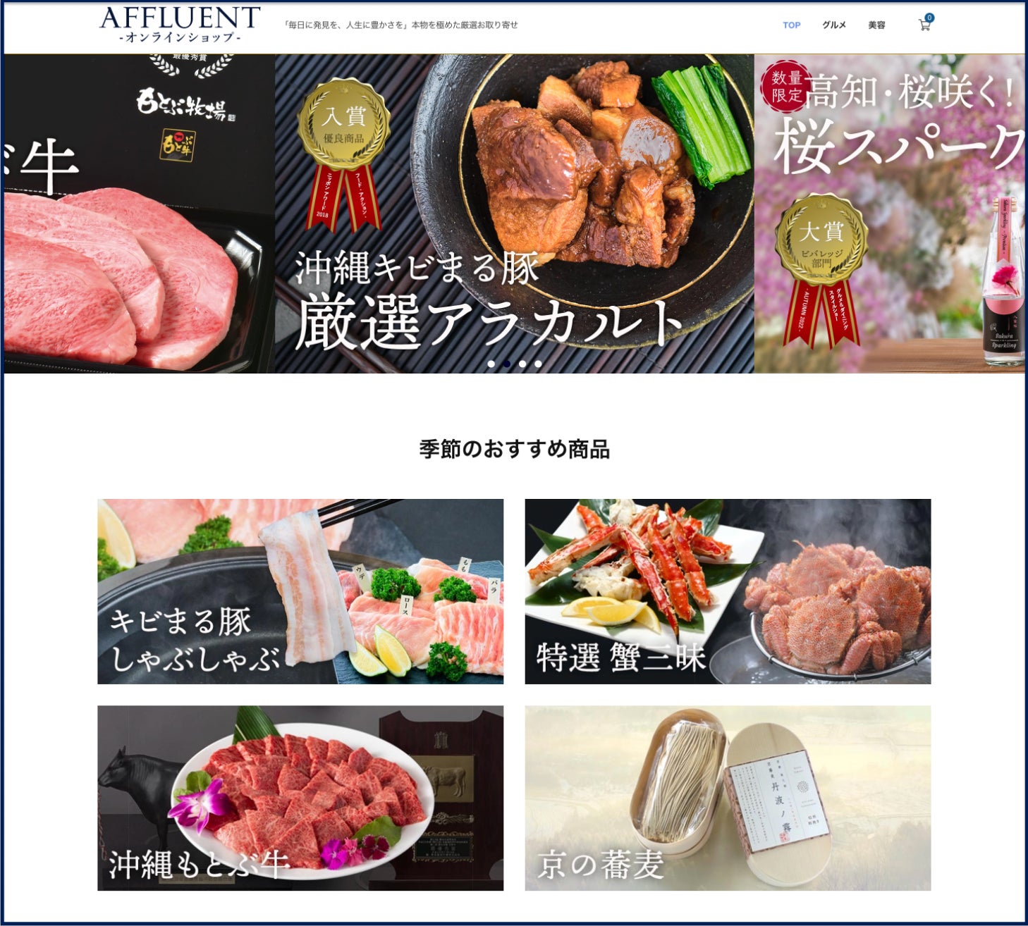 そして富裕層をターゲットに情報を発信するWEBメディア「AFFLUENT WEB」とも記事連携。グランドオープン記念企画として、フード・アクション・ニッポンアワード2018で優良商品入賞を獲得した沖縄・キビまる豚の特集を紹介しています。