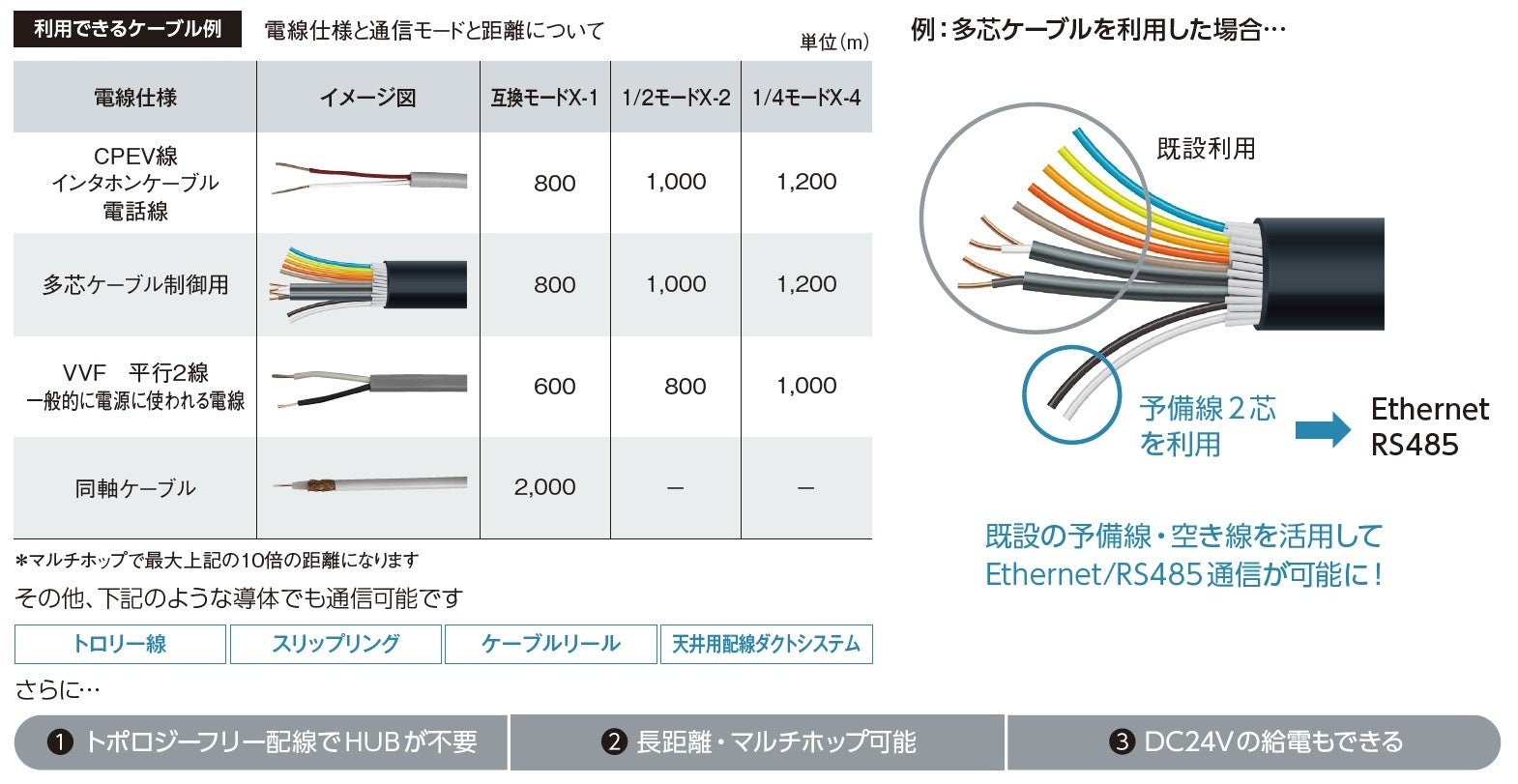 ケーブルの種類に関わらず、2本の線でEthernet/RS485の通信ができます