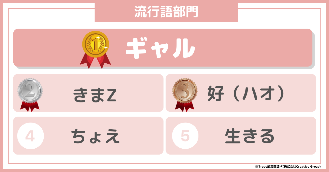 5位にランクインしたのは、TikTok発の流行語「生きる」。元々面白い時や、嫌なことがあった時にZ世代の間で使われていた「死ぬ」という言葉が、マイナスな意味であるため、その代わりに「生きる」を使おうという発言が高校生中心に賛同され広まりました。前向きな言葉で、笑い飛ばそうとする肯定的なイメージが、若々しさを感じるとして大人世代からもいい印象を受けています。