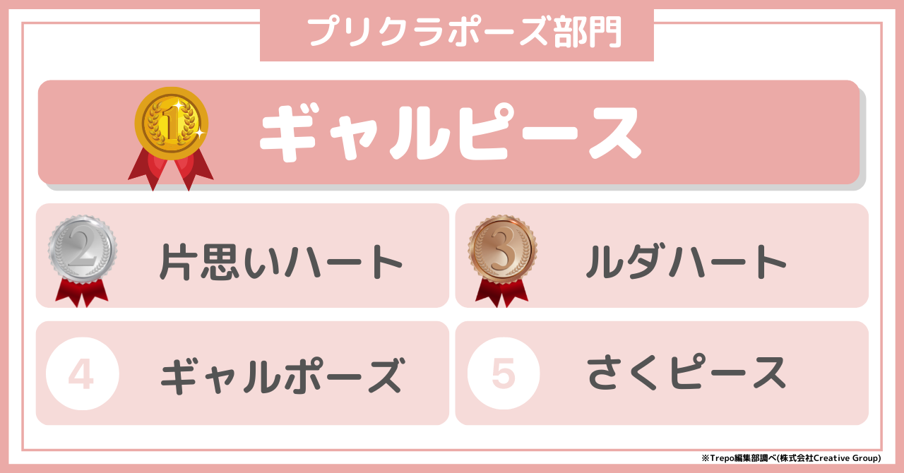 2位にランクインしたのは、「片思いハートポーズ」。片手ではハートを作り、もう片方の手ではグットポーズをするポーズです。Twitter上で“オタク”がアイドルとチェキ写真を撮る「推し活」が数年前から人気を集めていますが、この際、“オタク側”がハートポーズを作り、アイドルはグットポーズしている"片思い"な画像が有名になり、このポーズを真似する人が急増しました。また、プリクラ上だけでなく日常のショットを撮る際のポーズとして使う人も続出しています。