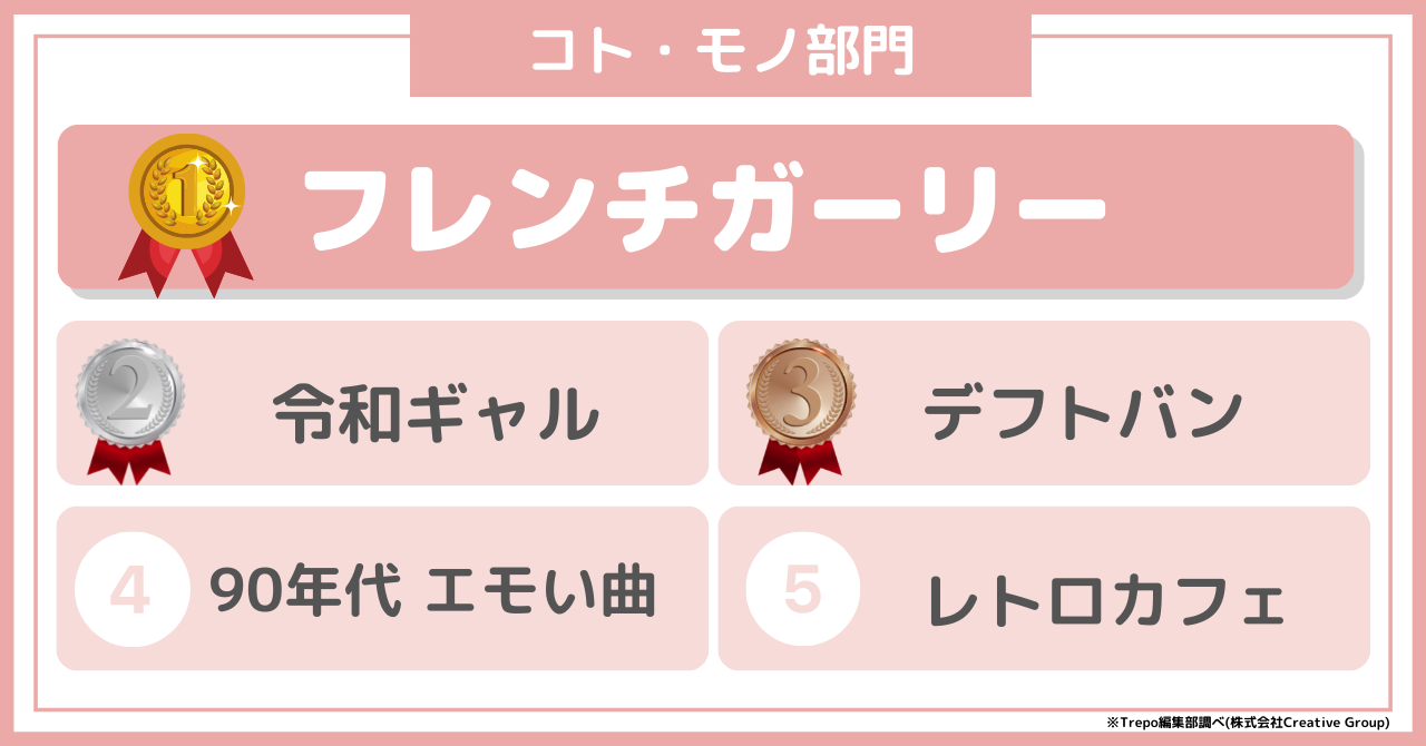【コト・モノ部門】、【プリクラポーズ部門】、【流行語部門】では、「ギャル」から派生したものがランクインし、平成時代に巻き起こった「ギャルブーム」が再熱したと考えられます。さらに、【コト・モノ部門】では「90年代 エモい曲」、「レトロカフェ」がランクインし、【グルメ・スイーツ部門】では「クリームソーダ」がランクインしています。