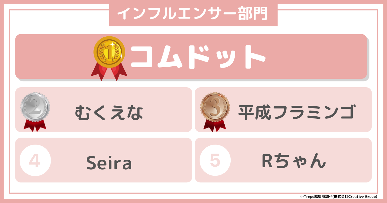 3位は、チャンネル登録者数290万人を突破(2022年6月時点)した2人組女性YouTuber「平成フラミンゴ」。幼馴染である「RIHO」「NICO」で結成され、二人の行動や言動が重なる「シンクロ」が話題となり、TikTokでは「シンクロ集」がファンの間で投稿されるなどその仲の良さが人気の一つとなっています。また、東京ガールズコレクションや関西コレクション、雑誌での表紙、テレビ番組への出演も果たしました。