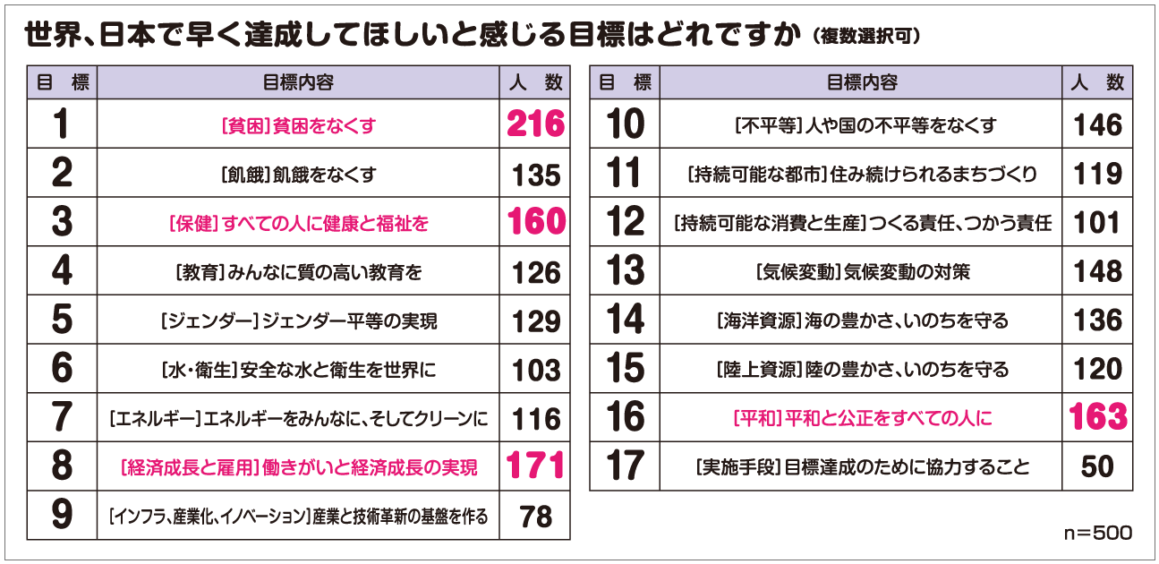 どの項目も大切なものですが、どの目標を重視するか、「世界、日本で早く達成してほしい」と思う目標の1位は「貧困をなくす」でした。