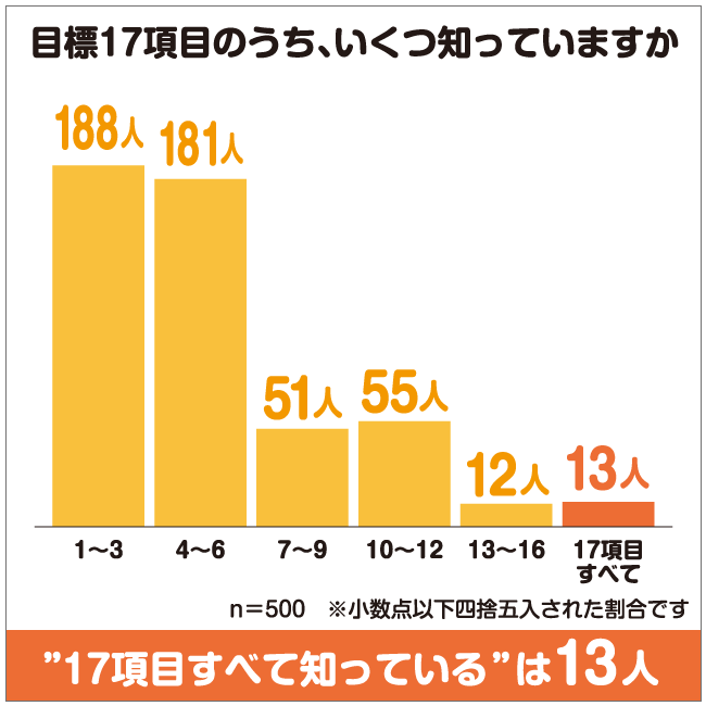 SDGsに対しては、「環境に良いことをする」という漠然としたイメージを持っているだけの人も多く、17ある目標のうち、全てを知っているという人はわずか13人でした。最も多いのは96人の人が知っていると答えた「3つ」でした。