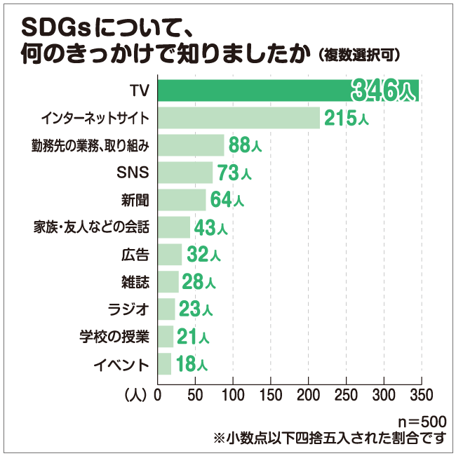 どのようなきっかけでこのSDGsを知ったのか聞いてみたところ、TVがトップ、ついでインターネットという結果になりました。CMや動画広告でもSDGsへの取り組みをアピールする企業が増えているからでしょうか。