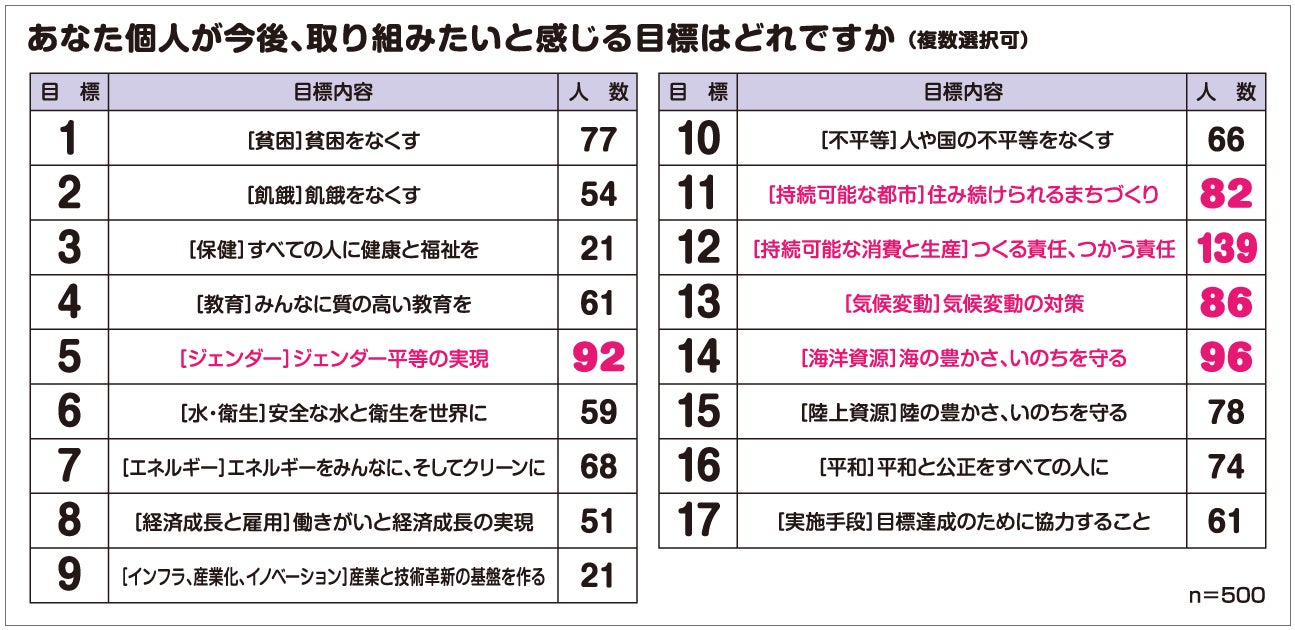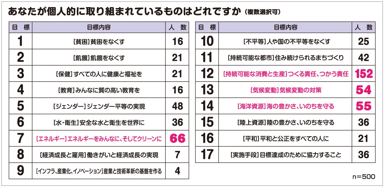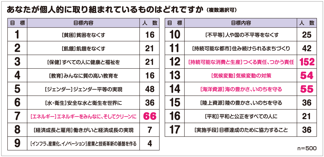 「つくる責任、つかう責任」は環境に配慮したものを購入したり、ゴミを出さない生活をしたりと、個人でも取り組みやすい目標だからでしょうか、2位とは2倍以上の差がありました。