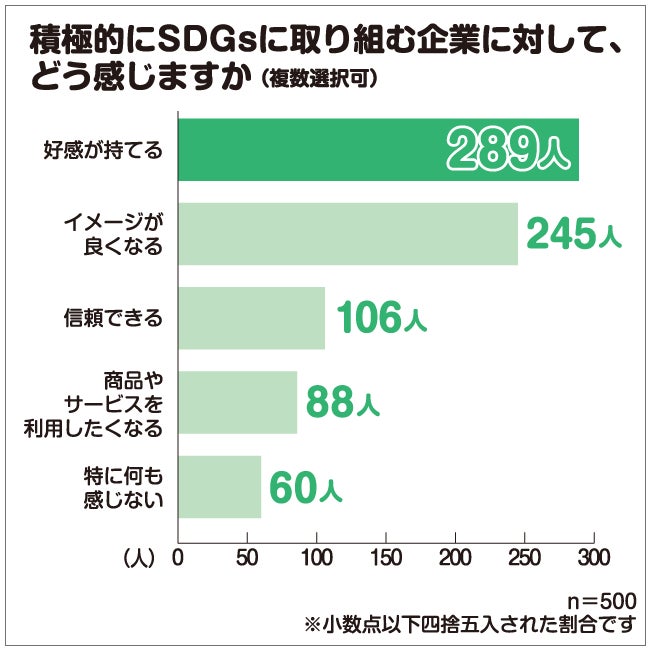 今回のアンケートでも、「好感が持てる」「イメージがよくなる」と答えた人が非常に多く、SDGsを取り入れることで企業のイメージアップにつながりますし、新たなビジネスチャンスを生み出す可能性もあります。