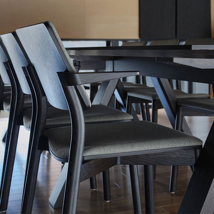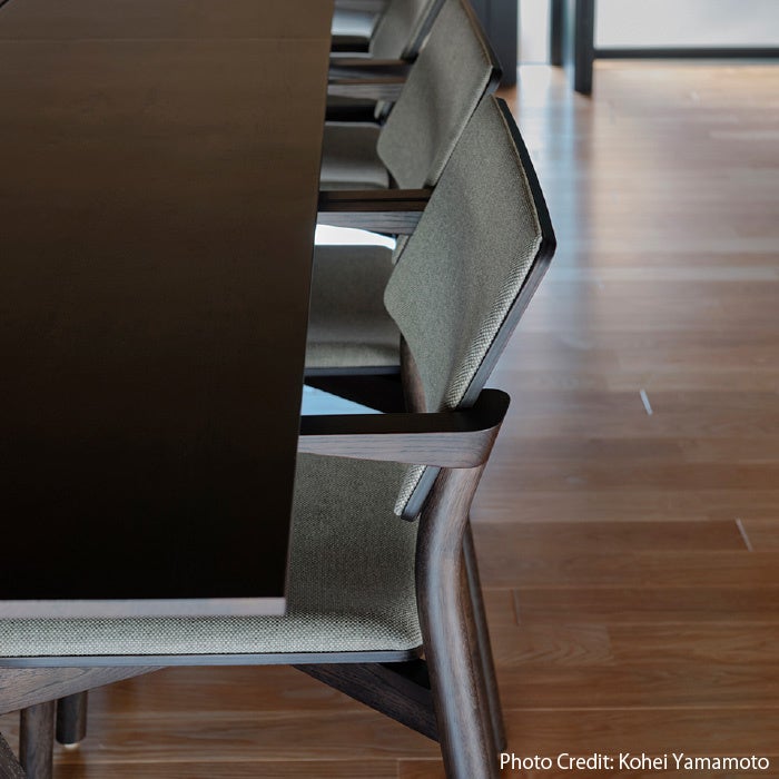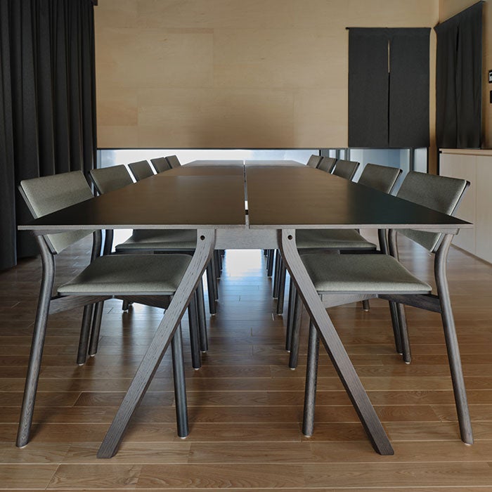 カリモクニュースタンダードの「Spectrum」「Panorama Armchair」をベースに、万博ルクセンブルクパビリオンのVIPダイニングルーム向けに製作された特注品。ナラ材の美しさと滑らかなフォルムが調和し、ルクセンブルクのデザイン精神を映し出しています。