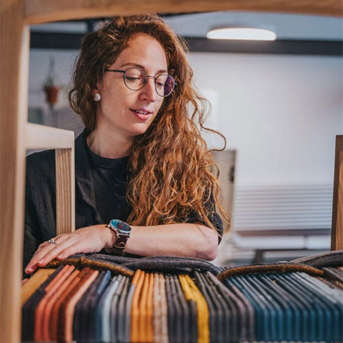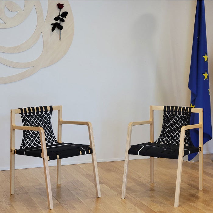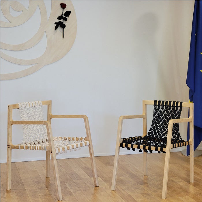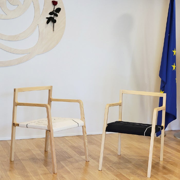 伝統的な織りの技法を現代的に再構築。シンプルで洗練された木製フレームと、天然コットンを織り込んだ柔らかな布製シートを組み合わせたチェア。万博ルクセンブルクパビリオンVIPルームで使用するために特注で製作され、デザイナーが自ら座面を編んだ限定モデルです。