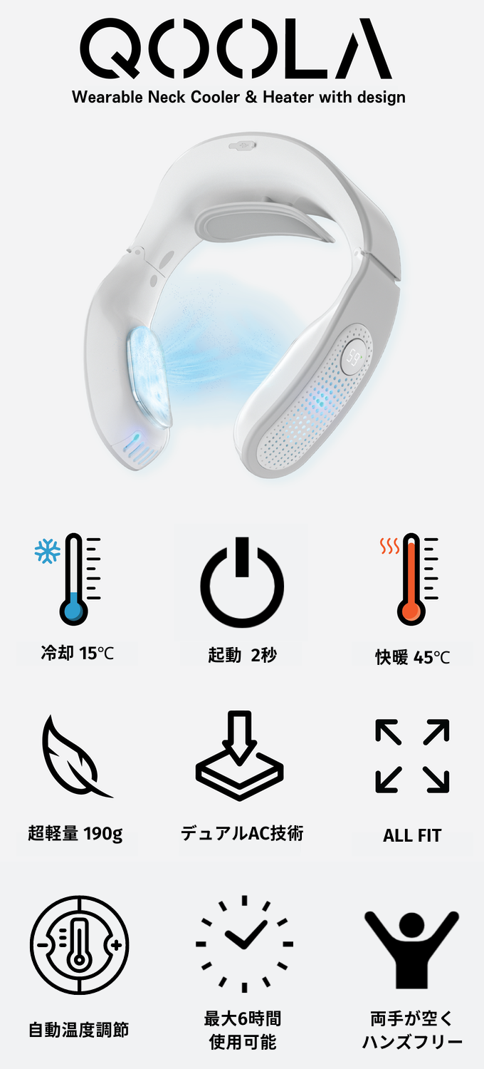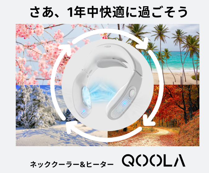 海外で約3400万円の支援を集めた話題のネッククーラー&ヒーターQOOLAがMakuakeにて日本先行販売を開始。8月限定の予約販売です。