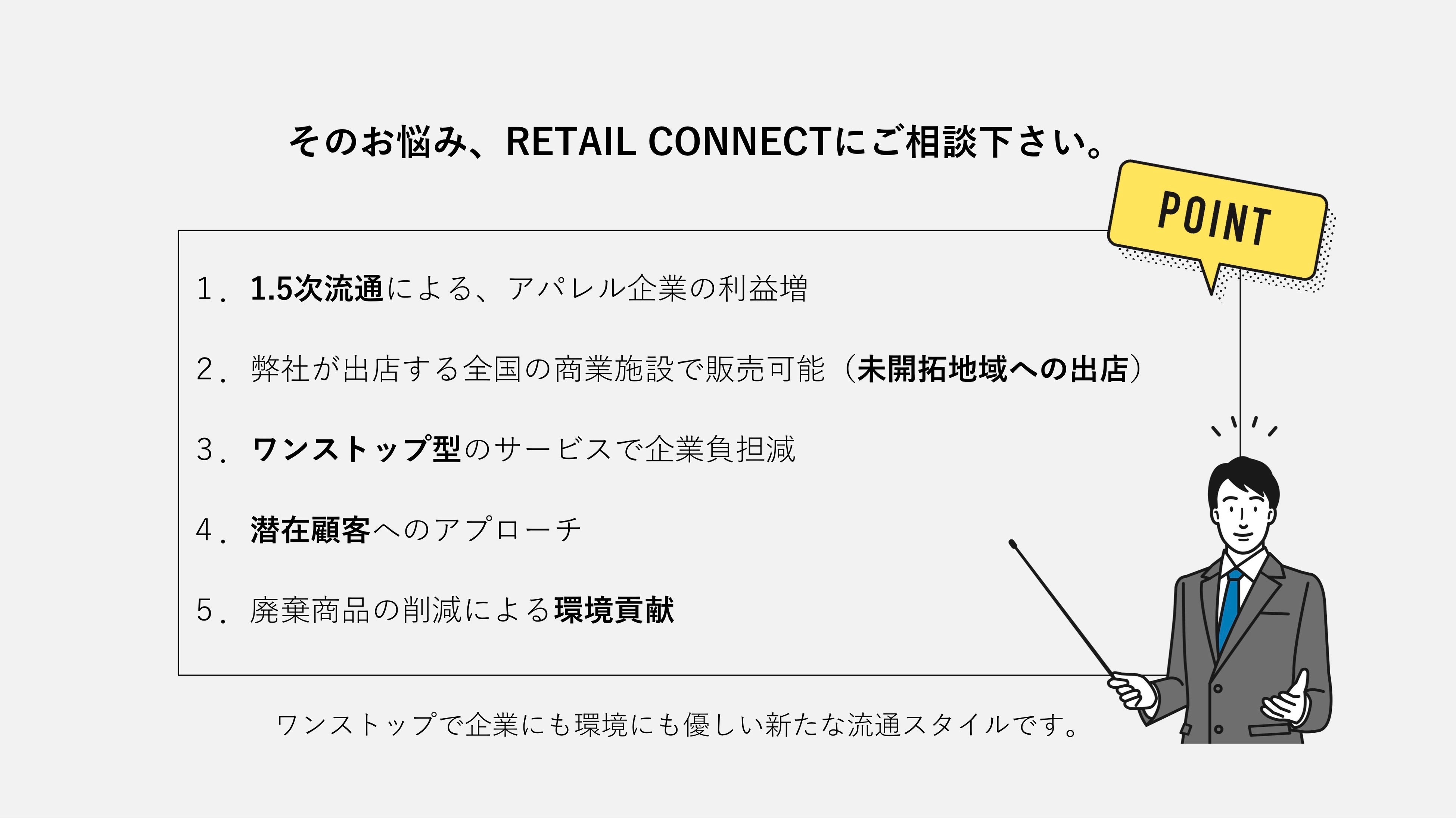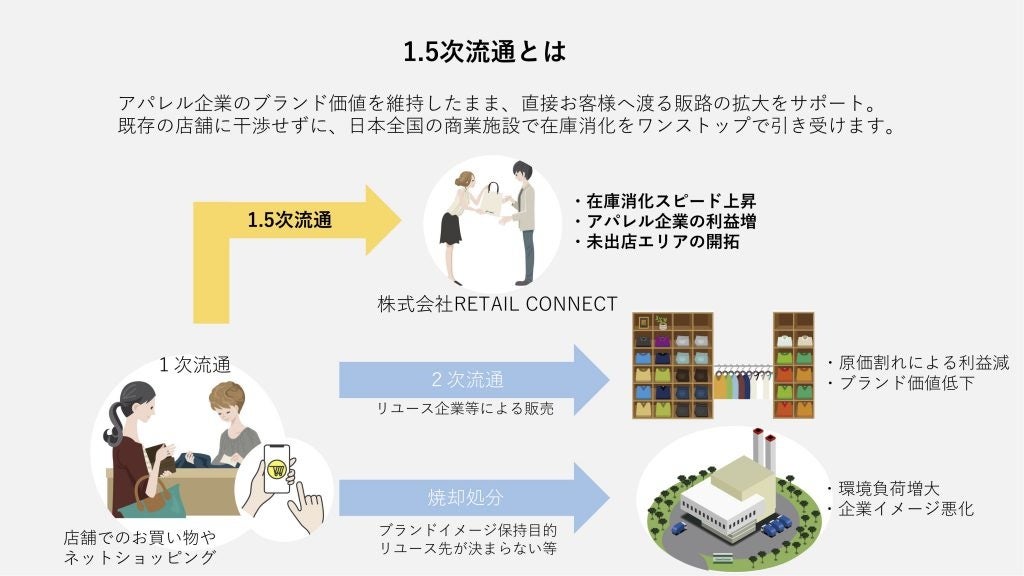私たち株式会社RETAILCONNECT(リテールコネクト)はその事実に、ファッションを見届ける立場として向き合い、2021年7月に「1.5次流通」という新しい流通のかたちを作りました。