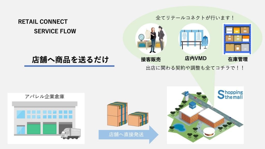 アパレル企業から「倉庫から店舗へ直接余剰の商品を発送するだけ」で既存の店舗に干渉せず、在庫消化をワンストップで引き受けます。