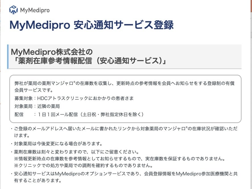 こうした問題により、新薬の供給における安定性とアクセスの問題が、患者様の治療選択肢に影響を与えていました。この問題を解決するため、MyMedipro(株)とHDCアトラスクリニックとは、日本で1位の約300名の糖尿病患者への投薬を継続しつづけ、その結果、その通院患者を維持するべく、新たに独自のオンライン診療システムを導入し、全国の患者様に対して安定した薬剤供給を目指します。その独自のサービスが「安心通知会員」サービスです。