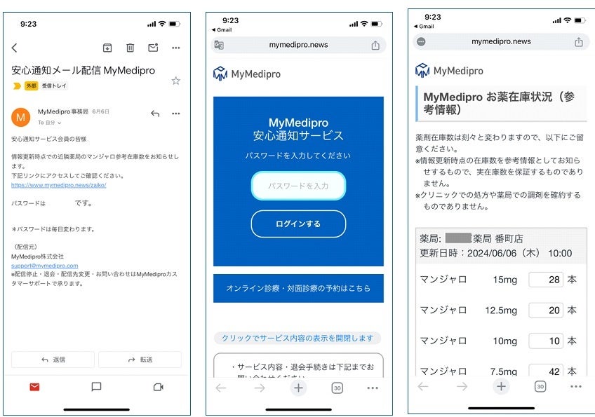 毎朝10時に、近隣および全国の薬局のマンジャロ在庫状況が更新され、メールを通じて患者様に通知されます。