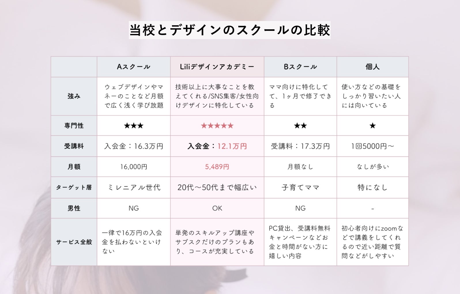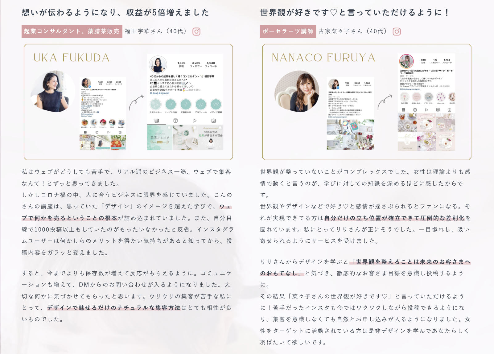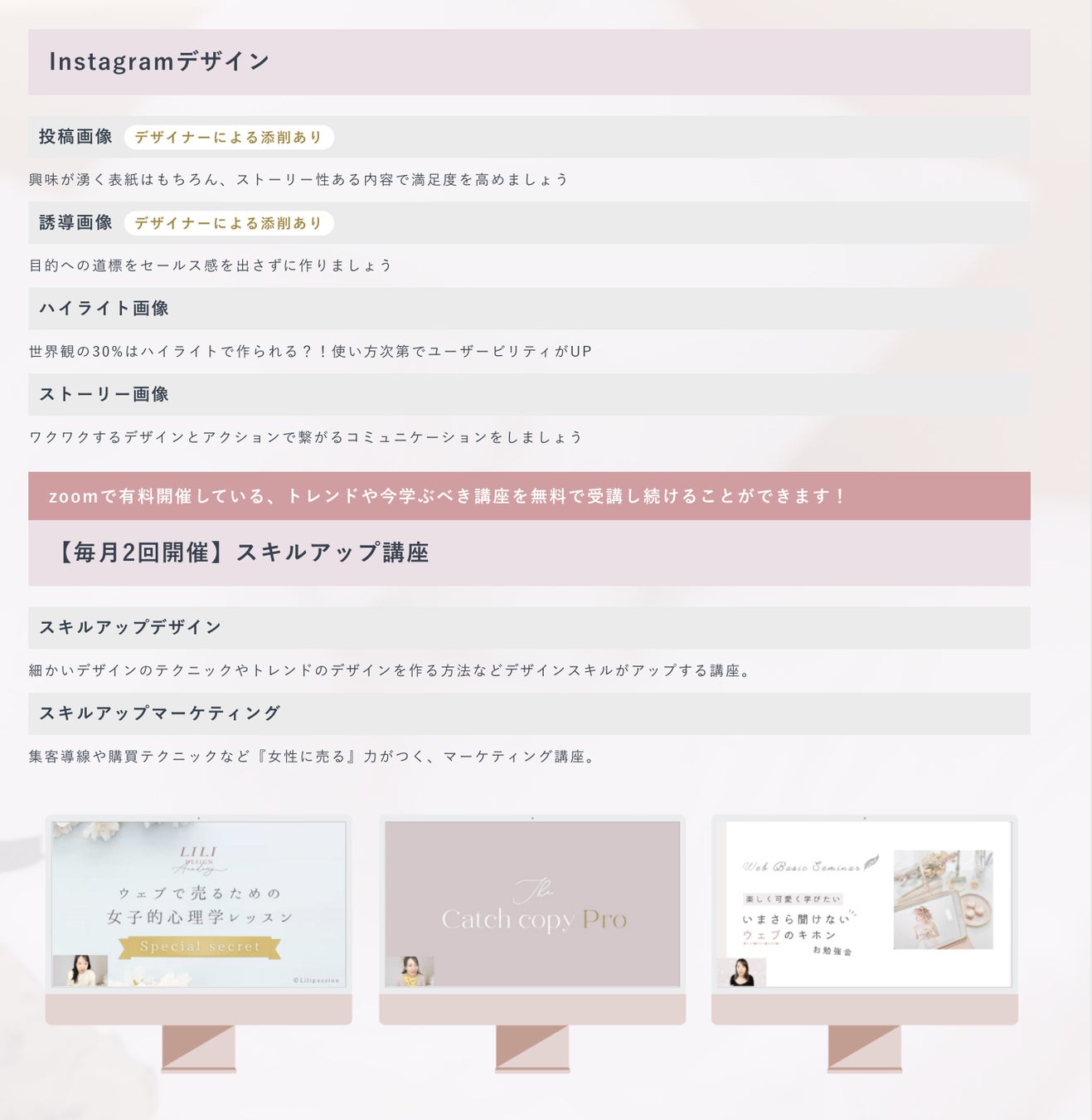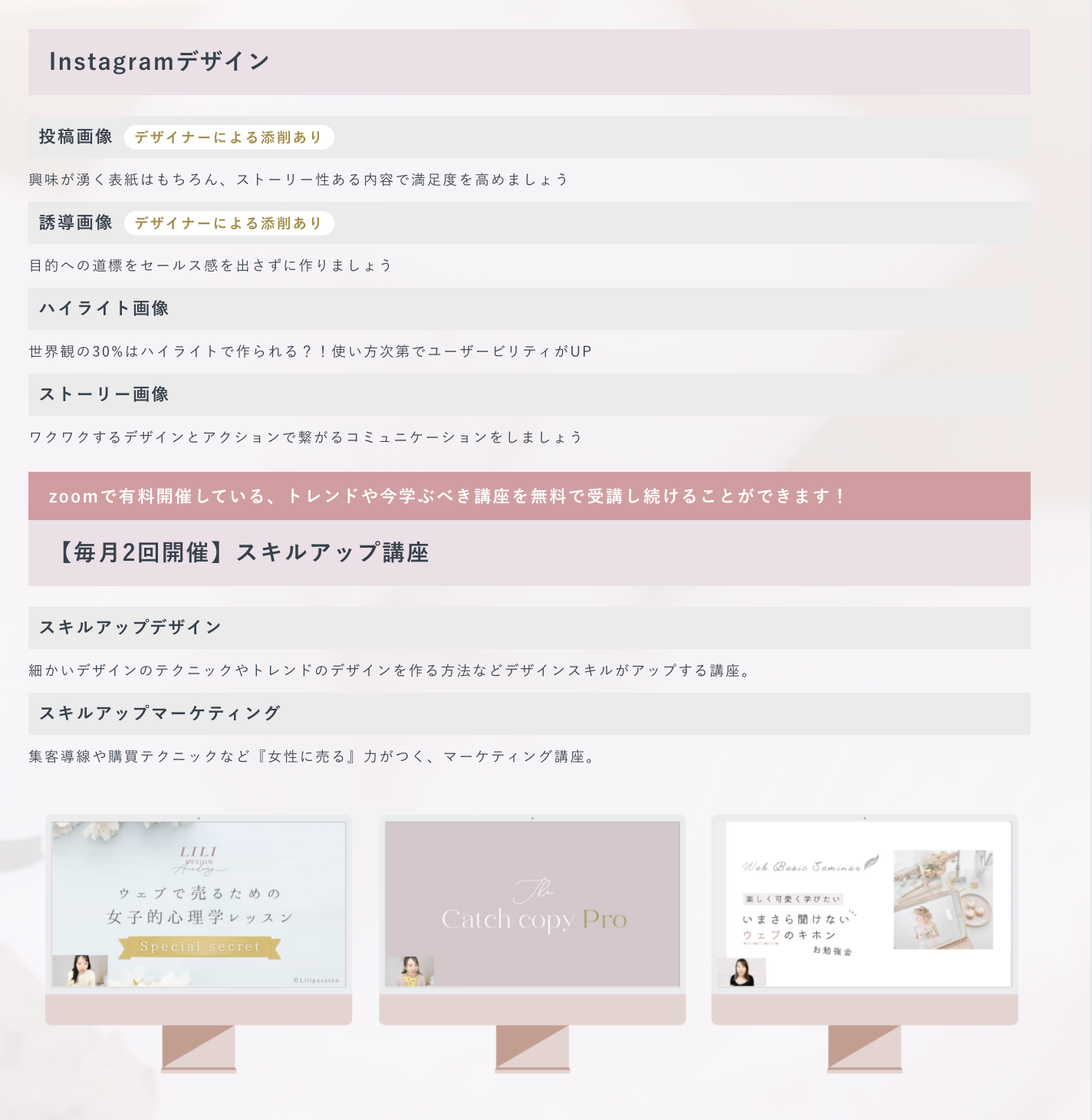 こちらは、_gramデザイナーとしてデザイン制作を受注や、canva講師として仕事をするための起業向け講座になっています。新たにデザイナーとして活躍したい方はもちろん、「他社でデザインの勉強をしてみたけれどうまくいかない」「どう活動していけば良いのか分からない」といった現役デザイナーにもおすすめの講座になっています。Lilipassionの経営理念である『デザイン・コンサル業を通じて、女性の自立を支援する』通り、デザイン講座を通して、デザインで女性の自立を支援していけるよう日々奮闘しています。
