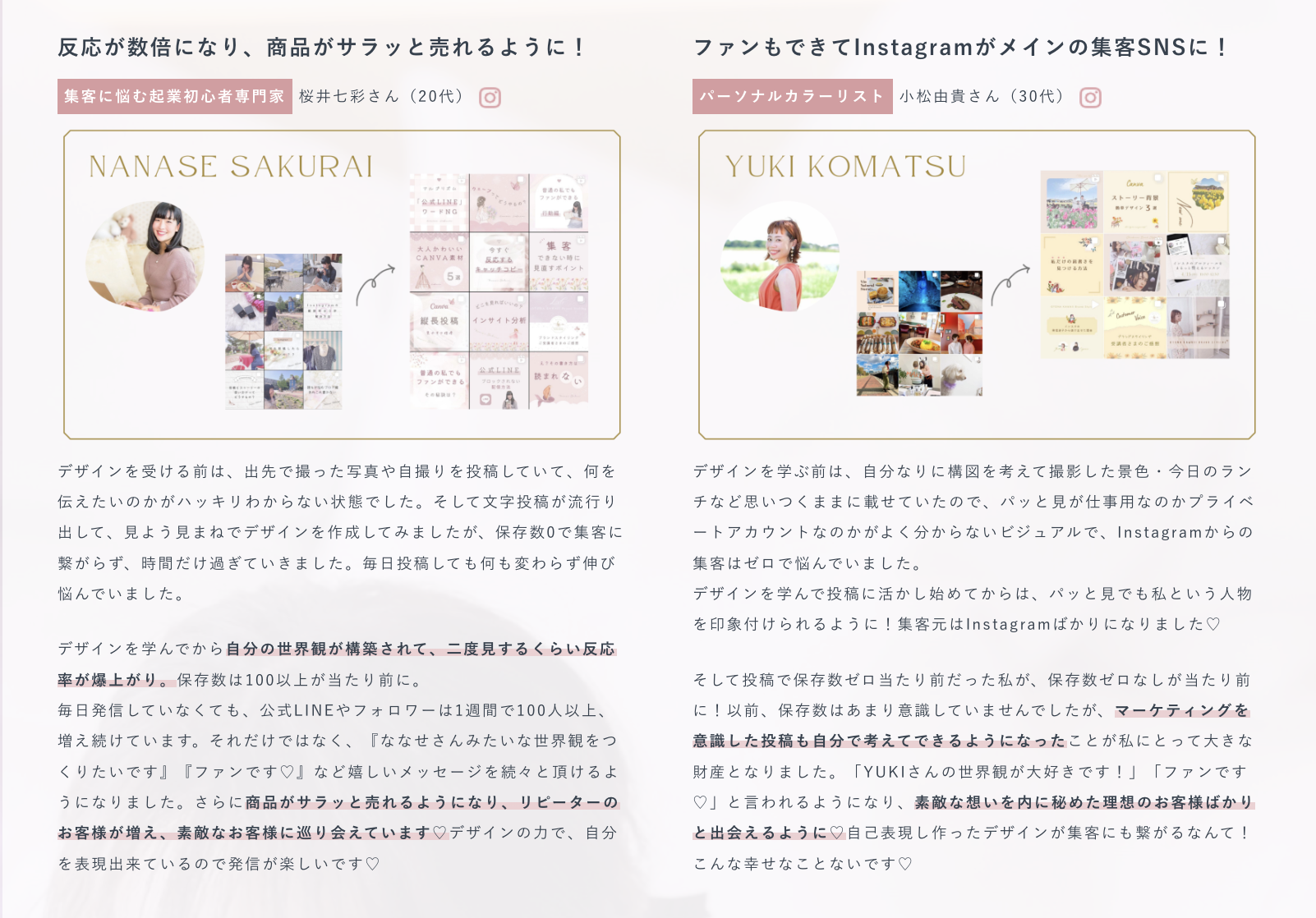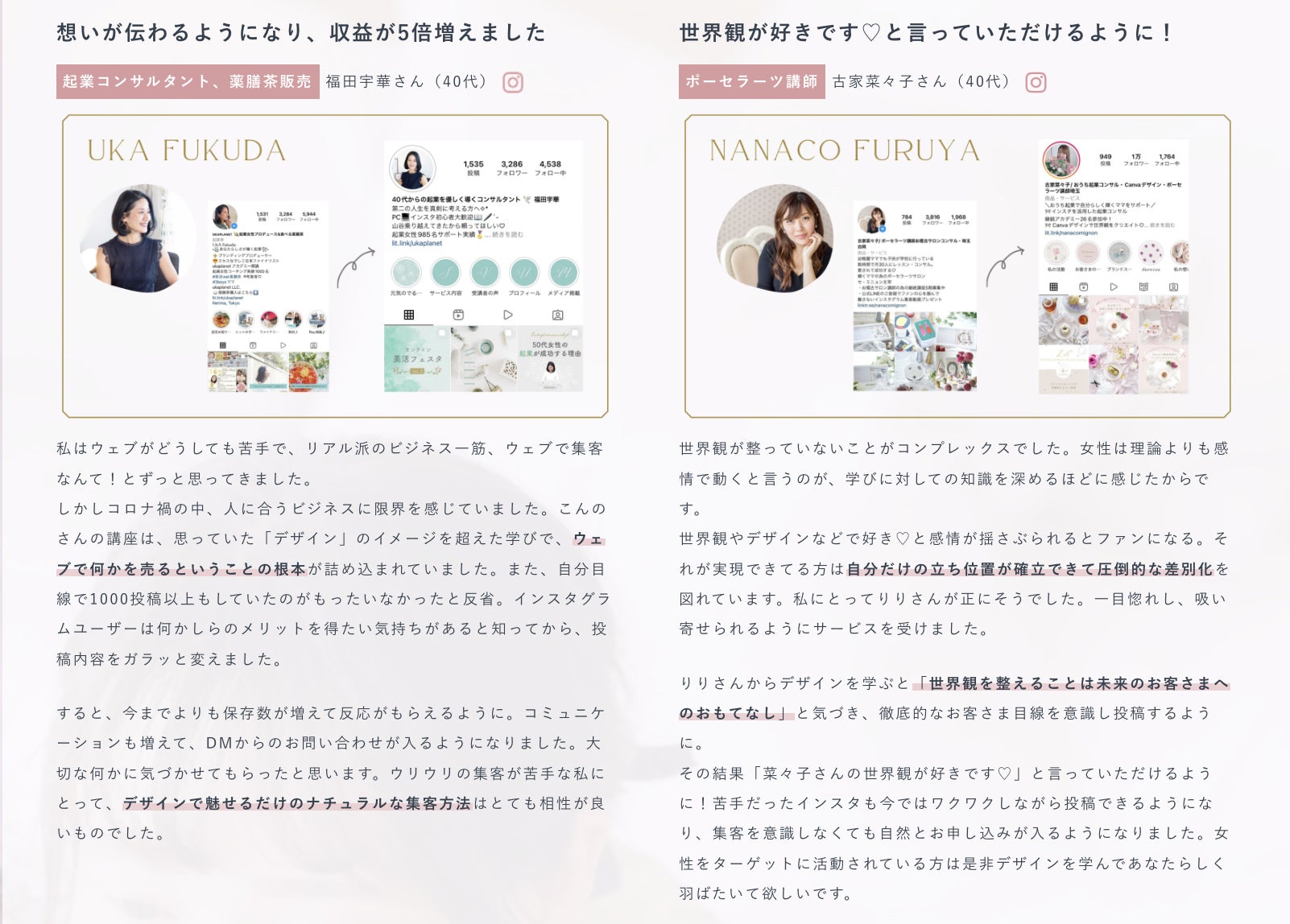 また、Webデザイナーとの差別化を図るために必要な知識として”マーケティング”を習得することで、ただ素敵なデザインができるデザイナーより”より集客できるデザイナー”としてクライアントに重宝される次世代のデザイナーを育成するため、マーケティングができるcanvaデザイナーを『_gramデザイナー』と名付け、デザイン講座のリリースにつながりました。
