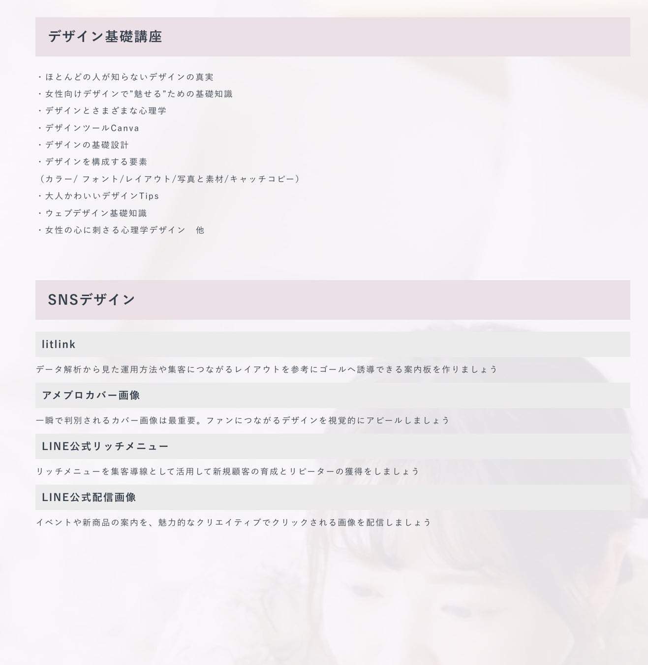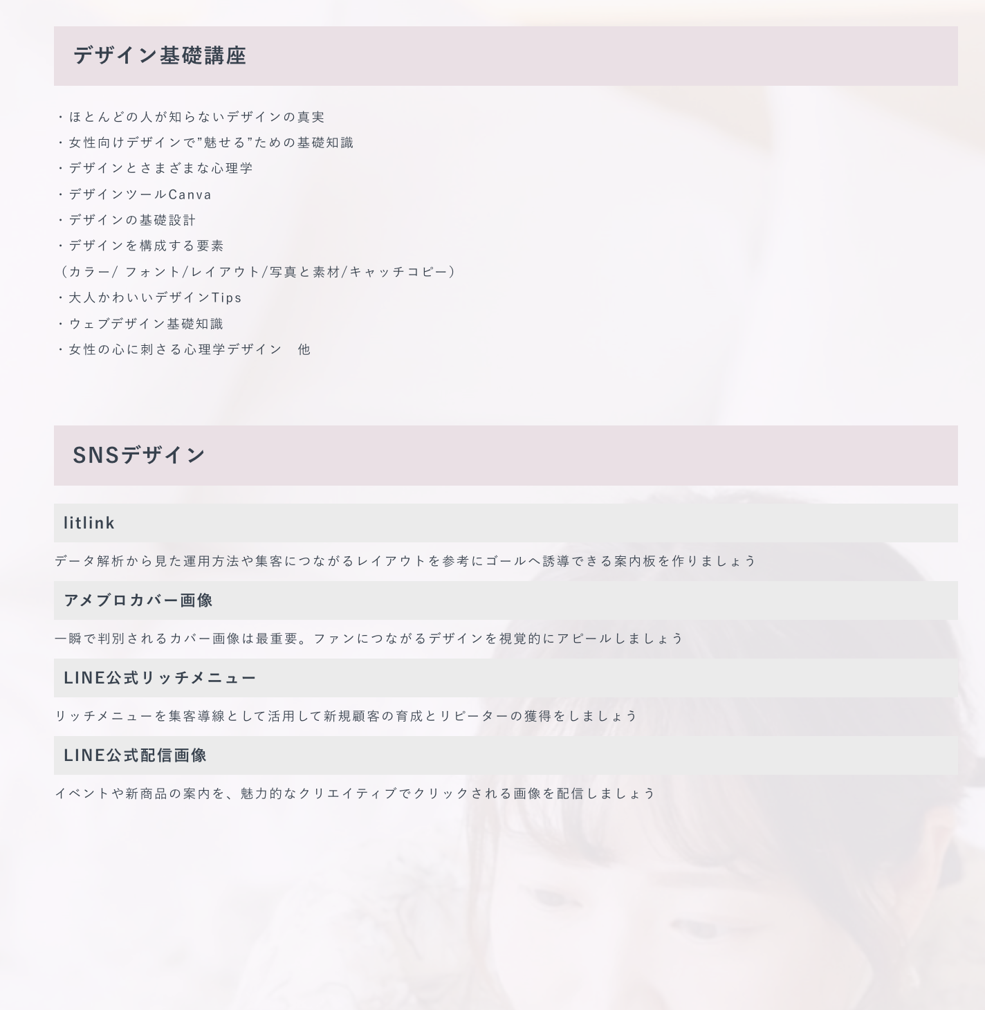 この講座は、デザインを学ぶだけで”自分のサービスに必要な基盤が整い+新しいサービスを展開できる”ことで、今おこなっているサービスが飛躍すると考えています。
