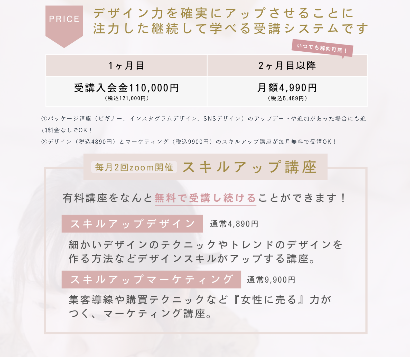 本講座は、入会金121,000円に加えて翌月から毎月5,490円の利用料が発生します。