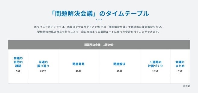 当サービスでは従来の学習塾のような授業は行いません。授業そのものに多額の料金を支払う時代は終息に向かっており、情報過多の現代で受験生から求められるのは情報の使い方です。弊社の指導では、週に1回1時間の「問題解決会議」で会議外の時間(24時間×7日-1時間)の使い方を全て決定します。勉強法からスケジュール、睡眠時間まで、全ての行動計画を立てることで自学自習の質を最大化する指導を行っております。情報そのものの価値が低下した現代において、ニーズが大きかったものだと考えられます。