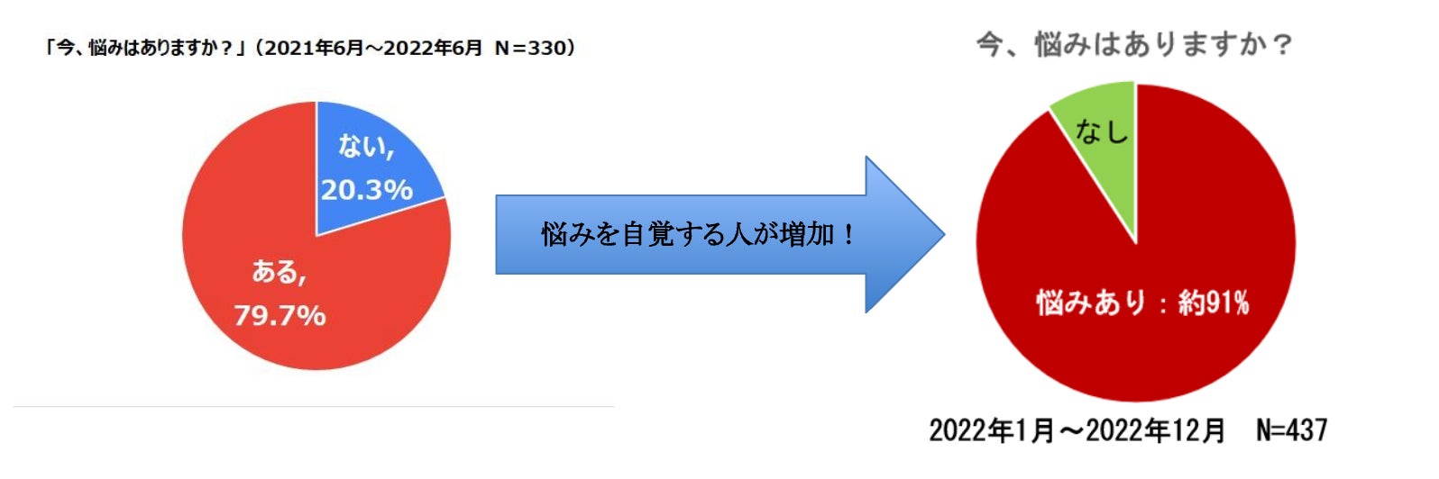 提供当初から調査を続けておりますが、昨年度の下半期で悩みを自覚しながら働く人が増加しているという結果となりました。被っている期間を斟酌しても、実質半年で悩みありと答えた人が10%以上も増加しました。