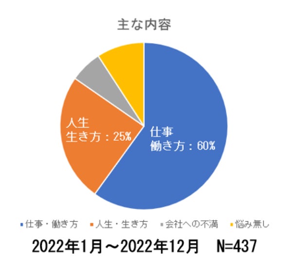 特に、「仕事・働き方」を悩みの内容とする例が60%を超え、自分の人生の中での“仕事”という行動を振り返りたいと思う人が多くなっています。会社内に相談できる環境を作っても、相談を利用していないという実態が浮き彫りになった結果だとの声もあります。