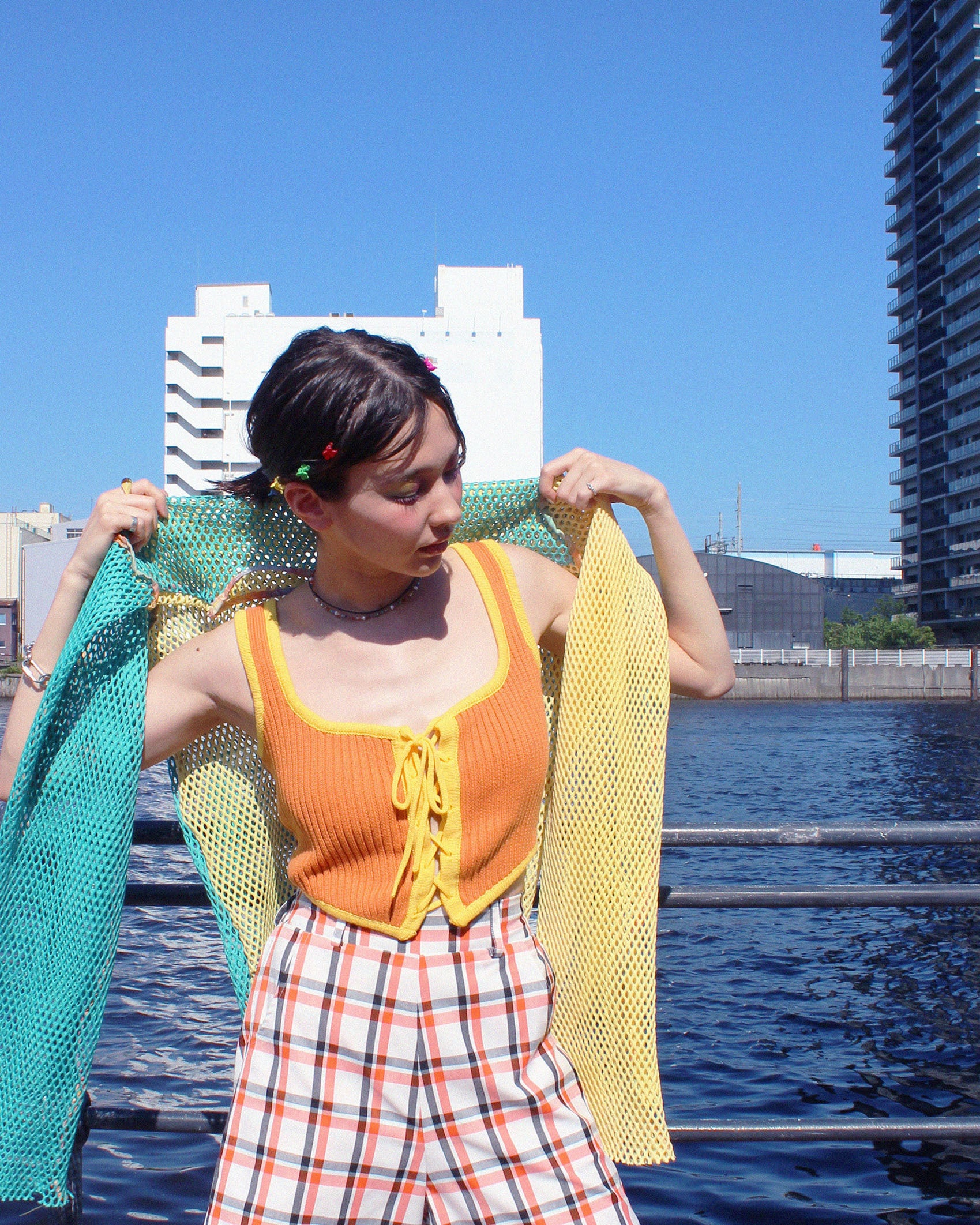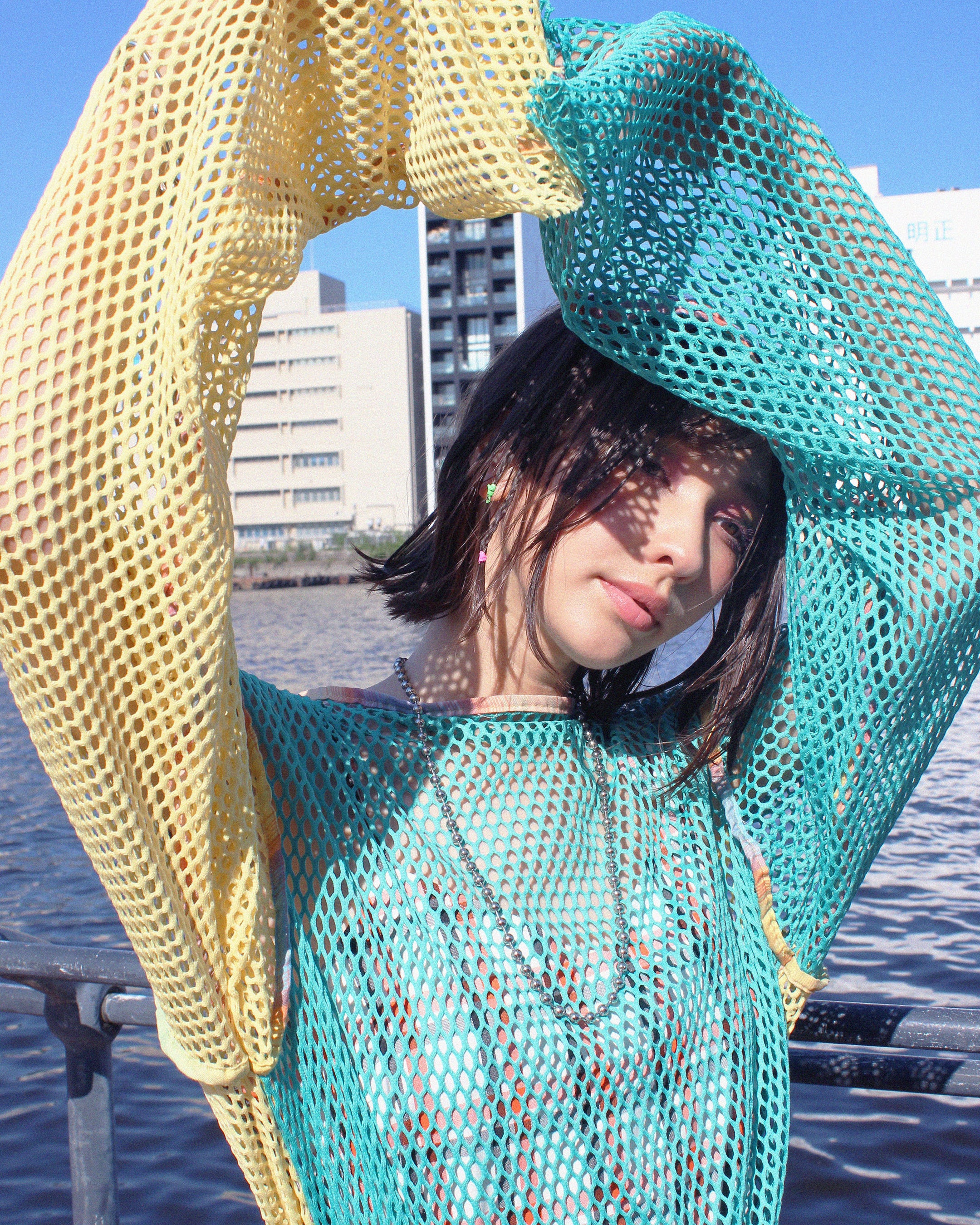 Scǎi tokyoらしいカラーブロッキングのメッシュトップスは、夏のレイヤードスタイルや羽織として活躍するアイテム。