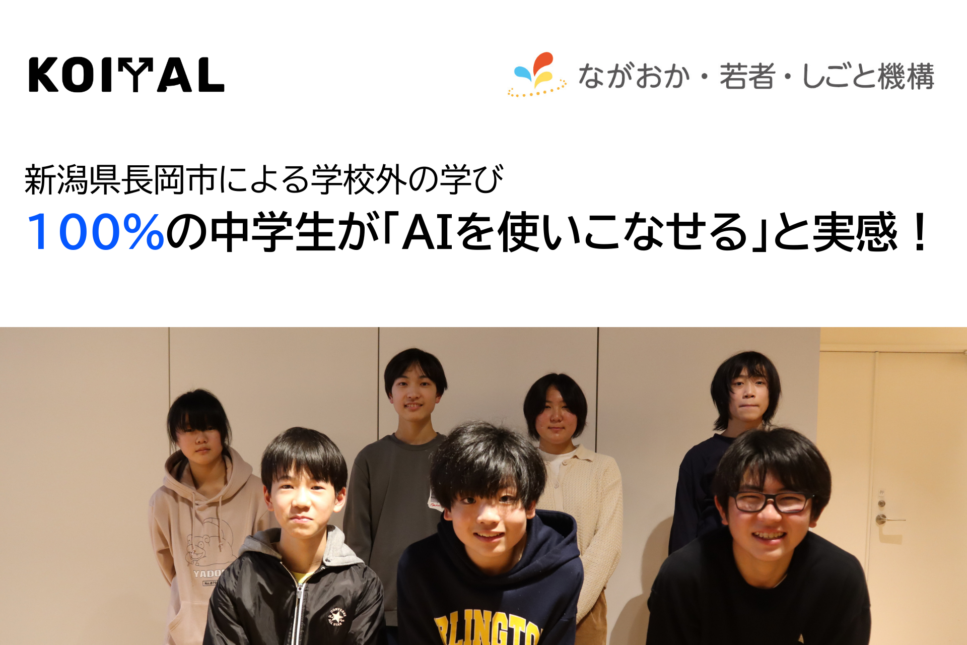 人材育成のための研修事業や教育事業を展開する株式会社KOIYAL(所在地:新潟県新潟市中央区本町通7番町1098‐1 WORKWITH本町、代表取締役:荒川善大)は、新潟県長岡市における学校外の学びとして、中学生向けAI活用型プログラミングクラブ「AIクリエイティ部」を実施。2026年3月7日、全13回の全行程を終了いたしました。本活動を通じ、参加生徒の100%が「AIを使いこなせる自身がついた」と回答するなど、生成AIをパートナーとした新しい学びの形を実証しました。