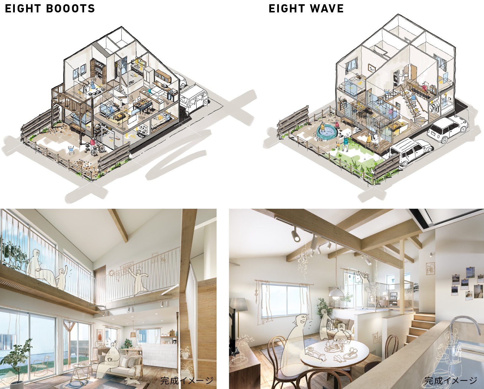 本事業では、BinOラインナップの中から有効利用面積が広く、多くのユーザーから支持されているロングセラーのスキップフロアモデル『WAVE』、おおきな吹き抜け空間や大開口の窓がある生活を楽しめる2階建てモデル『BOOOTS』の2モデルを選定。『「楽しむ」をデザインしよう!』を事業コンセプトに掲げユーザー中心のデザイン設計を得意とするエイトデザイン株式会社が、情報社会の中で忙しい現代人のライフスタイルをより効率的に、より快適に、より楽しい暮らしとなることを願い、『EIGHT WAVE』・『EIGHT BOOOTS』としてBinO本部協力のもとリデザインしました。