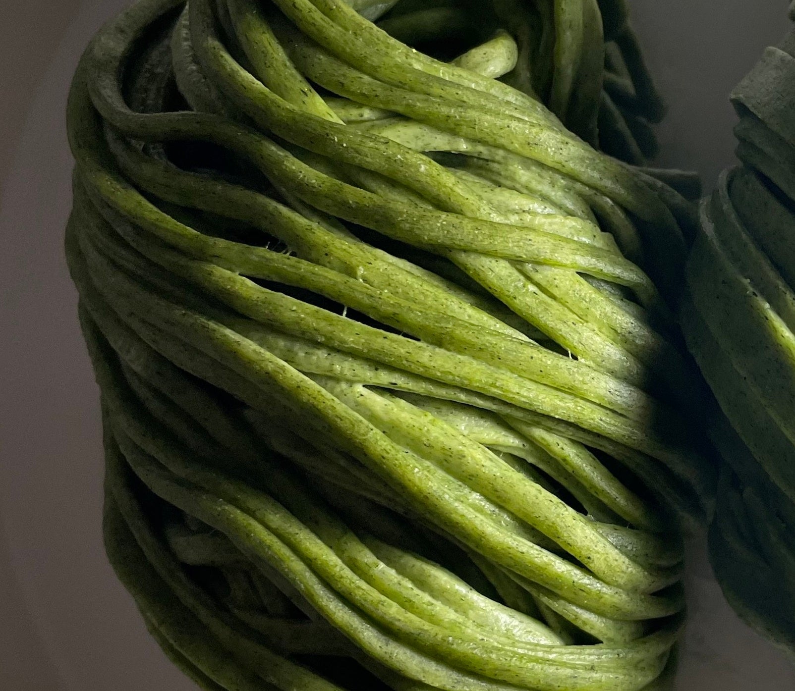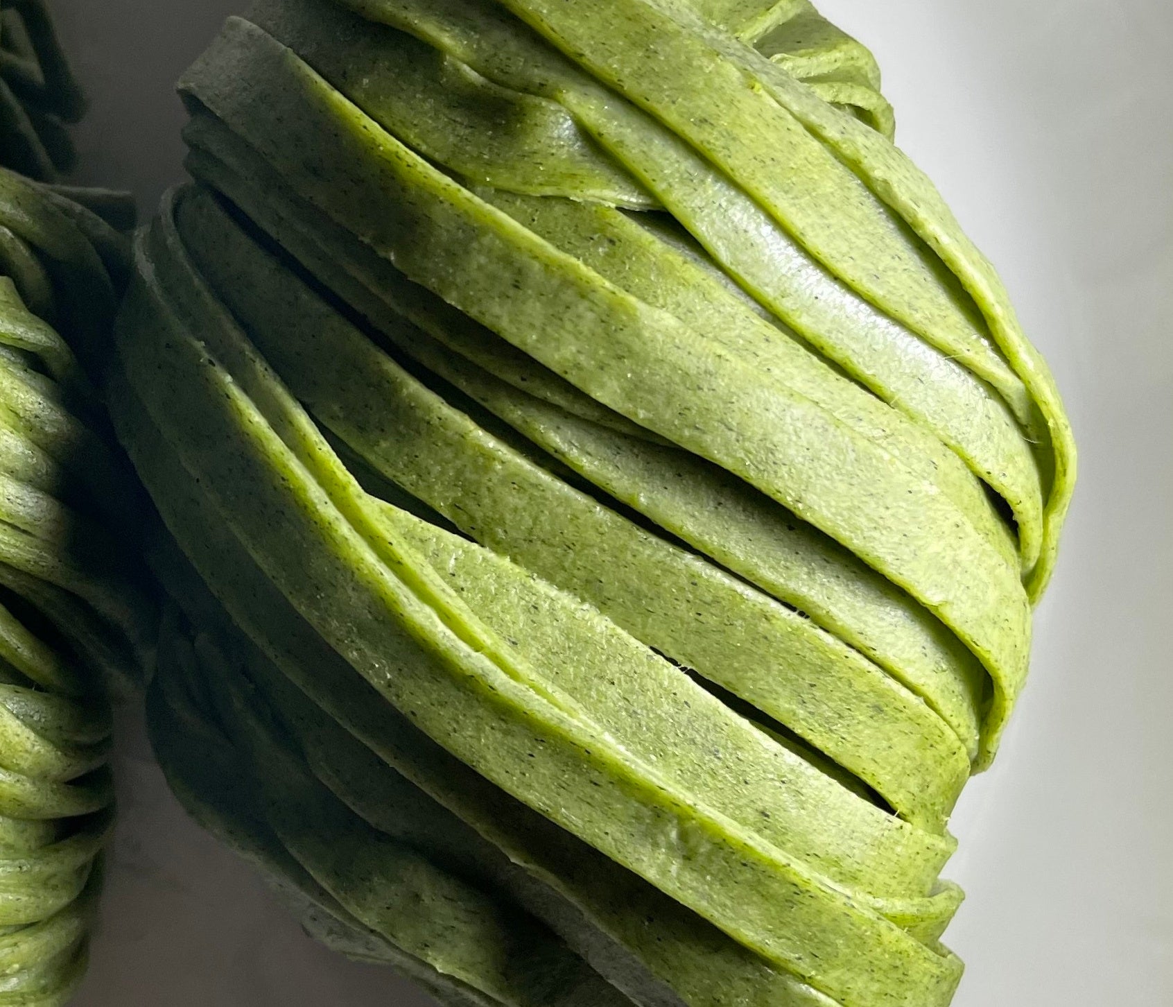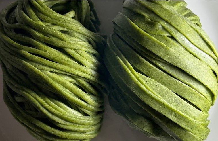 また、パスタには、1食あたり550mgのパブロバ藻粉末(フコキサンチン含量6mg)を使用し、パスタ職人が丁寧に仕上げた生パスタです。麺種は、リングイネとフェットチーネの2種類をご用意しています。魚介類や海藻類を使ったソースで仕上げると美味しくお召し上がりいただけます。