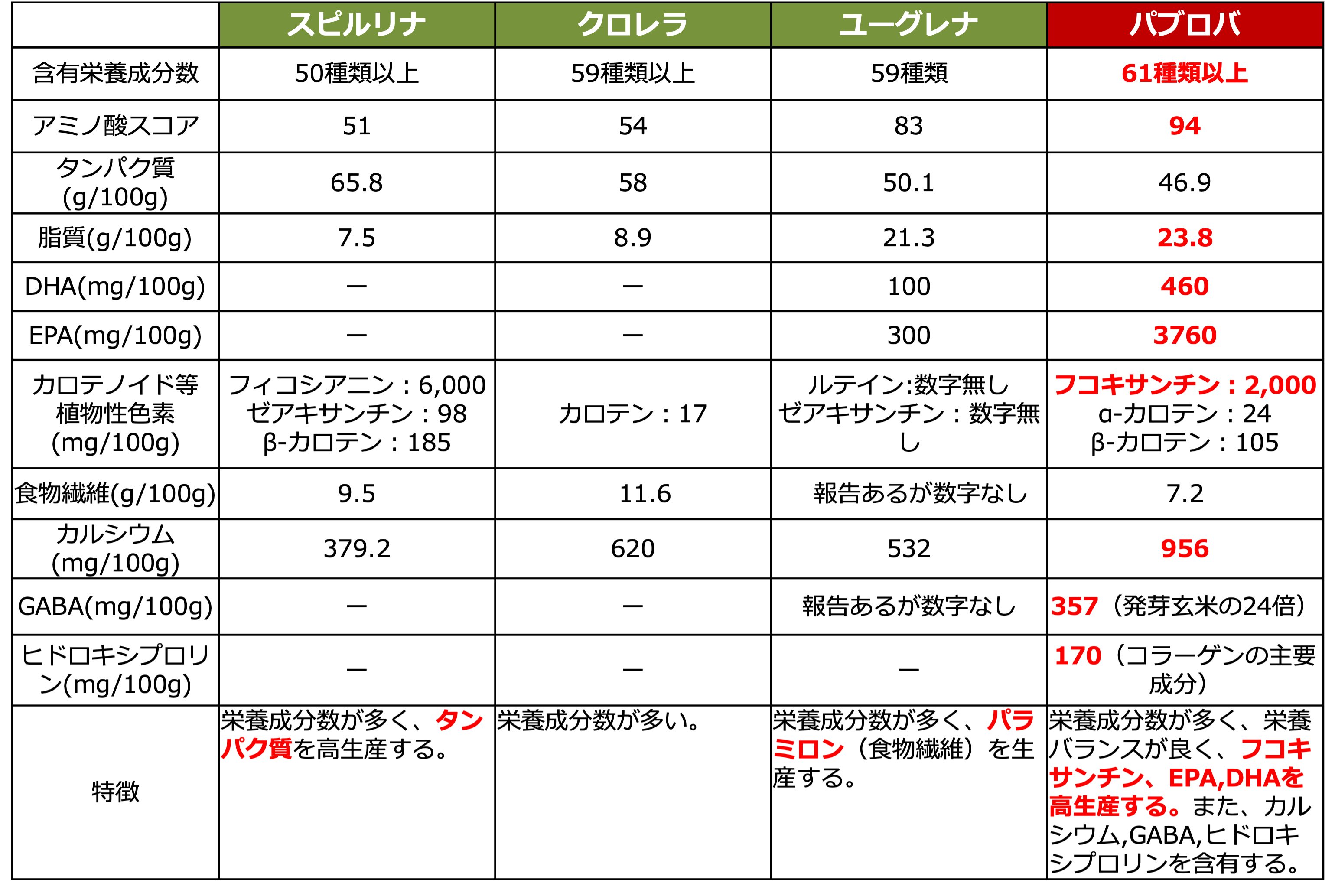 パブロバは、モズクや昆布などの含有成分としてメディアに取り上げられている注目の希少成分フコキサンチンを高含有(モズクや昆布の100倍以上)しており、更に、青魚の油脂成分として知られるEPAやDHAなどのオメガ3脂肪酸を多く含有(ユーグレナの10倍以上)していることが特徴です。その他、食物繊維やGABAなど合計61種類以上の多様な栄養成分を含んでいることが分かっています。