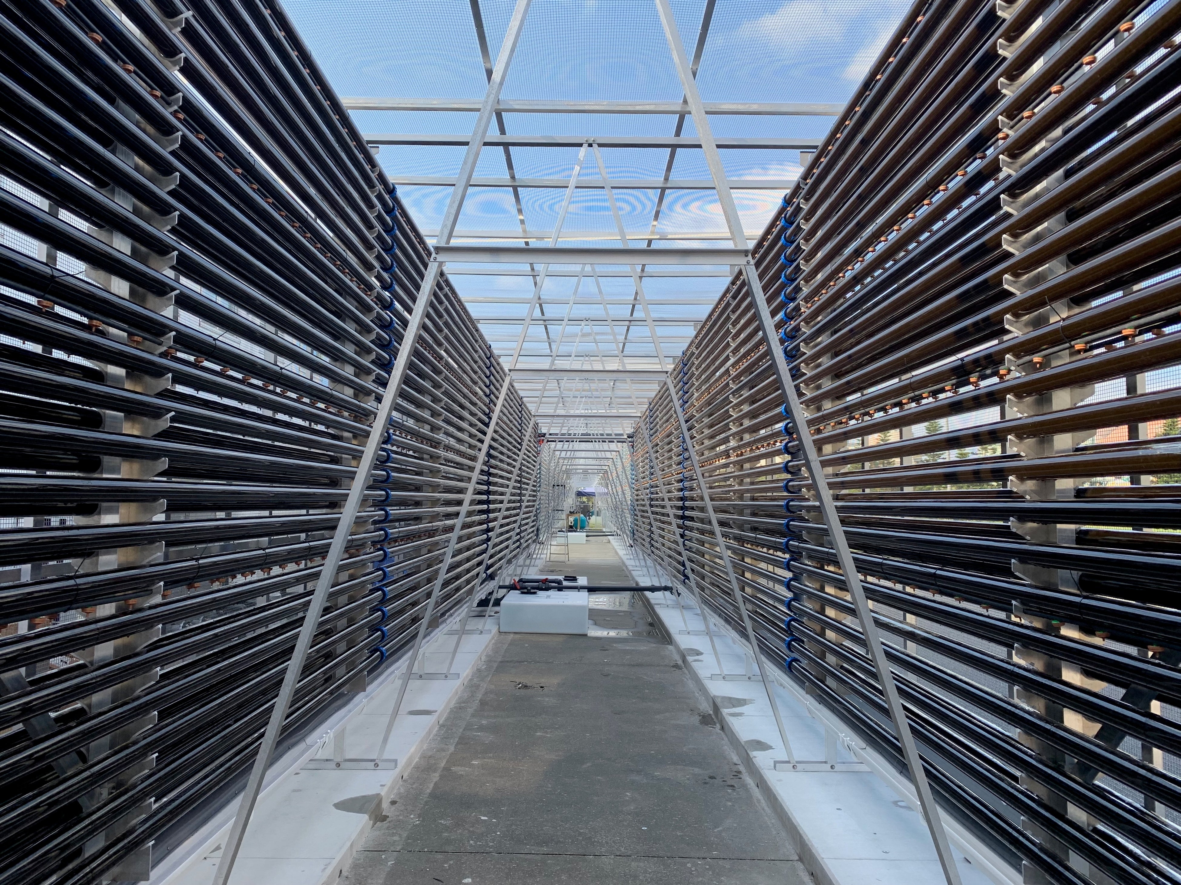 パブロバは、サステナブルな素材として注目の微細藻類の一種です。本種は、当社が沖縄本島北部沿岸域から採取し、ガラスチューブ型の培養装置を用いて沖縄の天然海水および自然光を使って原料生産を行っています。