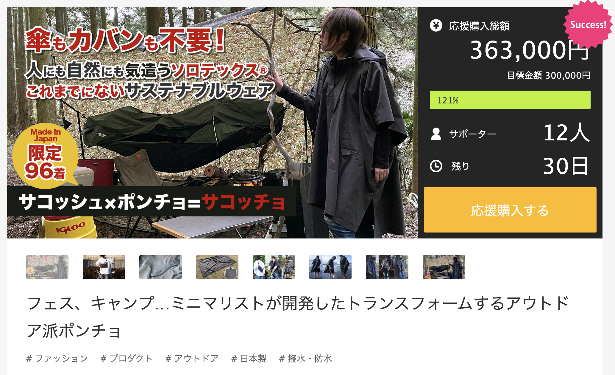 株式会社いちばんぼし(所在地:東京都品川区、代表:浅山佳映子)はトランスフォームするアウトドアポンチョ「サコッチョ」をMakuakeで先行販売を開始しわずか12時間で目標金額を達成したことをお知らせします。(プロジェクトページ:https://bit.ly/3tK2Vke)