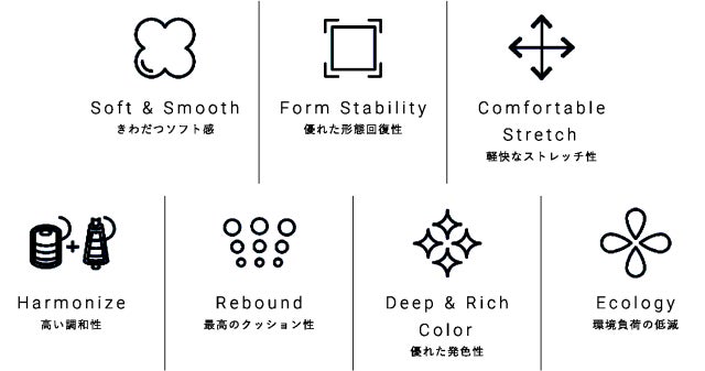 独自のバネのようならせん分子構造により、シワや肘抜け、膝抜けなどの型崩れを驚くほど抑えるとともに、美しいシルエットを長く保つことを助けます。そのため、多少雑に収納しても、シワが目立つことはありません。