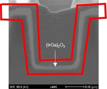 図1:新規イリジウム系材料を用いて、トレンチ内部への酸化イリジウムガリウム高品質埋込み成長に成功