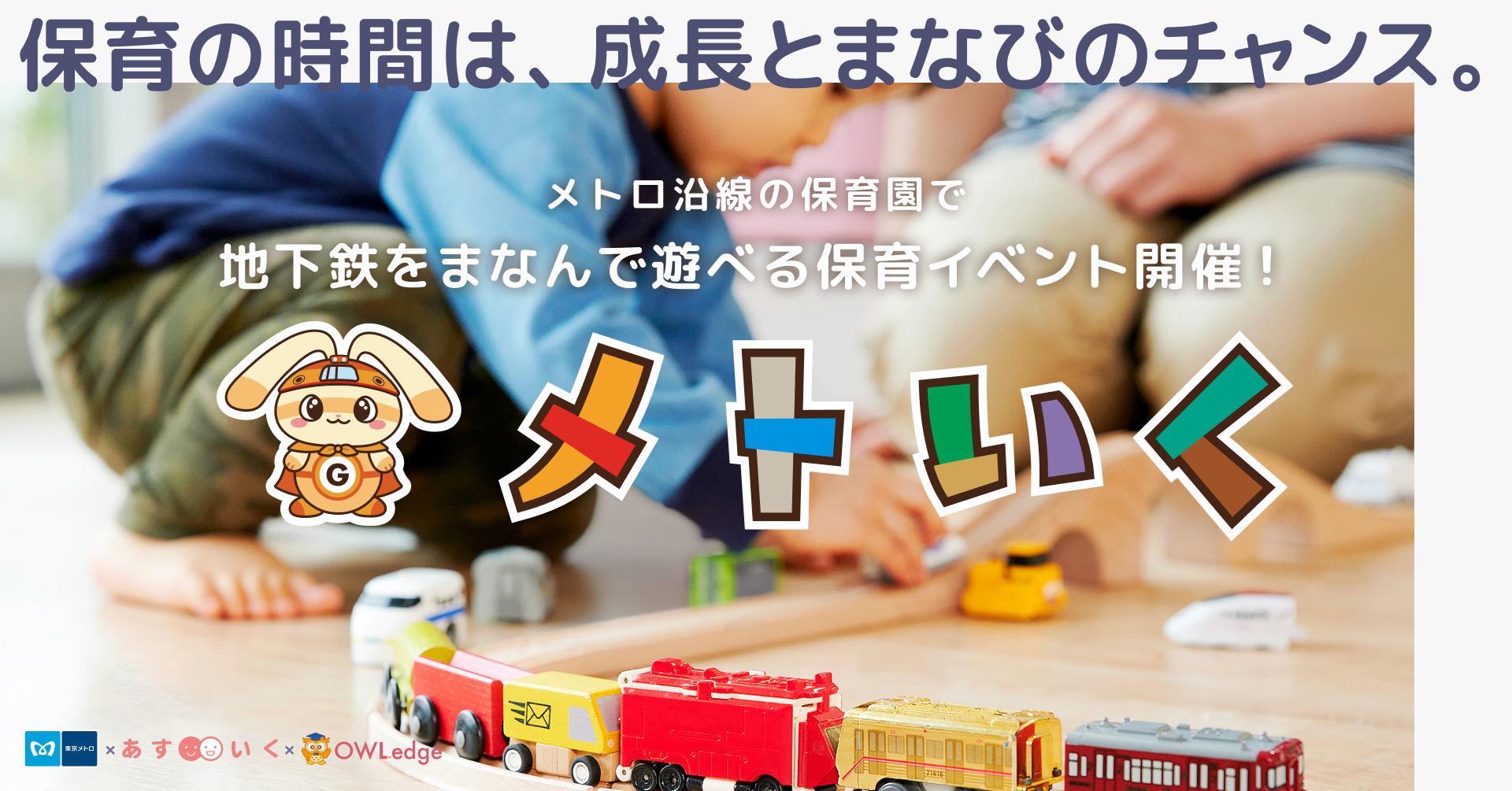 お子さまの一時保育検索をスマホ&LINEでいつでも検索・予約できるサービス「あすいく」を運営する株式会社grow&partners(本社:東京都豊島区 代表取締役:幸脇啓子、以下「grow&partners」)は、東京地下鉄株式会社(本社:東京都台東区、代表取締役社長:山村 明義、以下「東京メトロ」)及び株式会社OWLedge(本社:東京都中央区、代表取締役:佐々木 優、以下「アウレッジ」)とともに、東京メトロのコンテンツを生かしたオリジナルの教材を使用し、まなびと遊びを組み合わせた特別一時保育イベントを開催します。