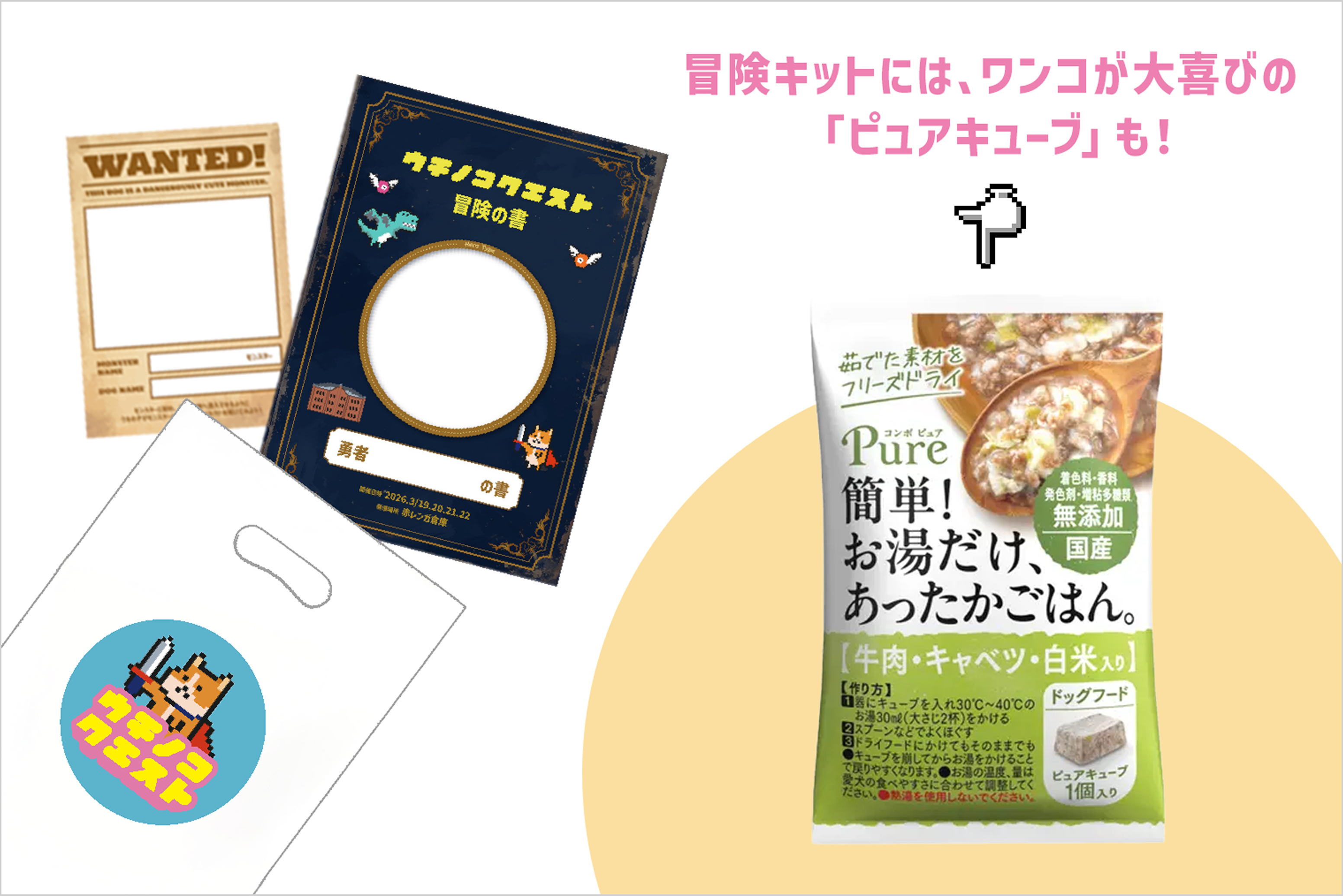 日本ペットフード株式会社さまの本物素材だけで作ったフリーズドライごはん「ピュアキューブ」のほか、エリエールPetの「キミおもい パワフル消臭シート」 など、飼い主さんもワンコも嬉しいアイテムが詰まったお得な冒険キットとなっています。